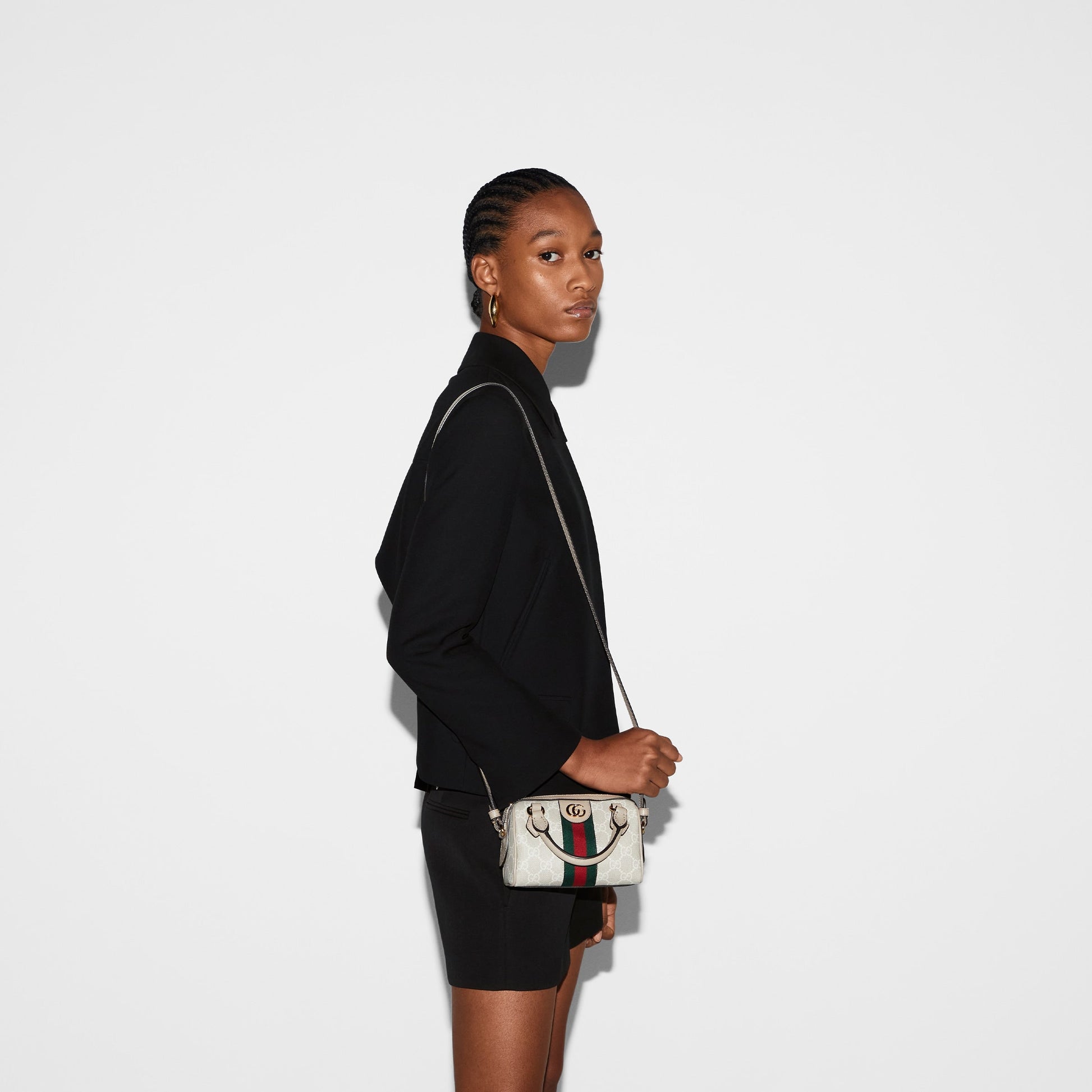 The Ophidia line is enriched by the introduction of the boston mini bag. Crafted from beige and oatmeal GG Supreme canvas, the accessory is enriched by the Double G hardware and a Web stripe. A detachable shoulder strap completes the design.