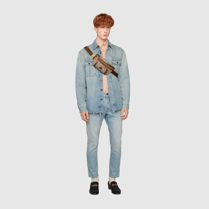 Materials, colors and House codes come together to infuse styles with a vintage feel. Here, this belt bag is crafted from beige and ebony GG Supreme canvas with a brown leather trim. The style is completed by one of Gucci’s most historic codes—the Interlocking G.