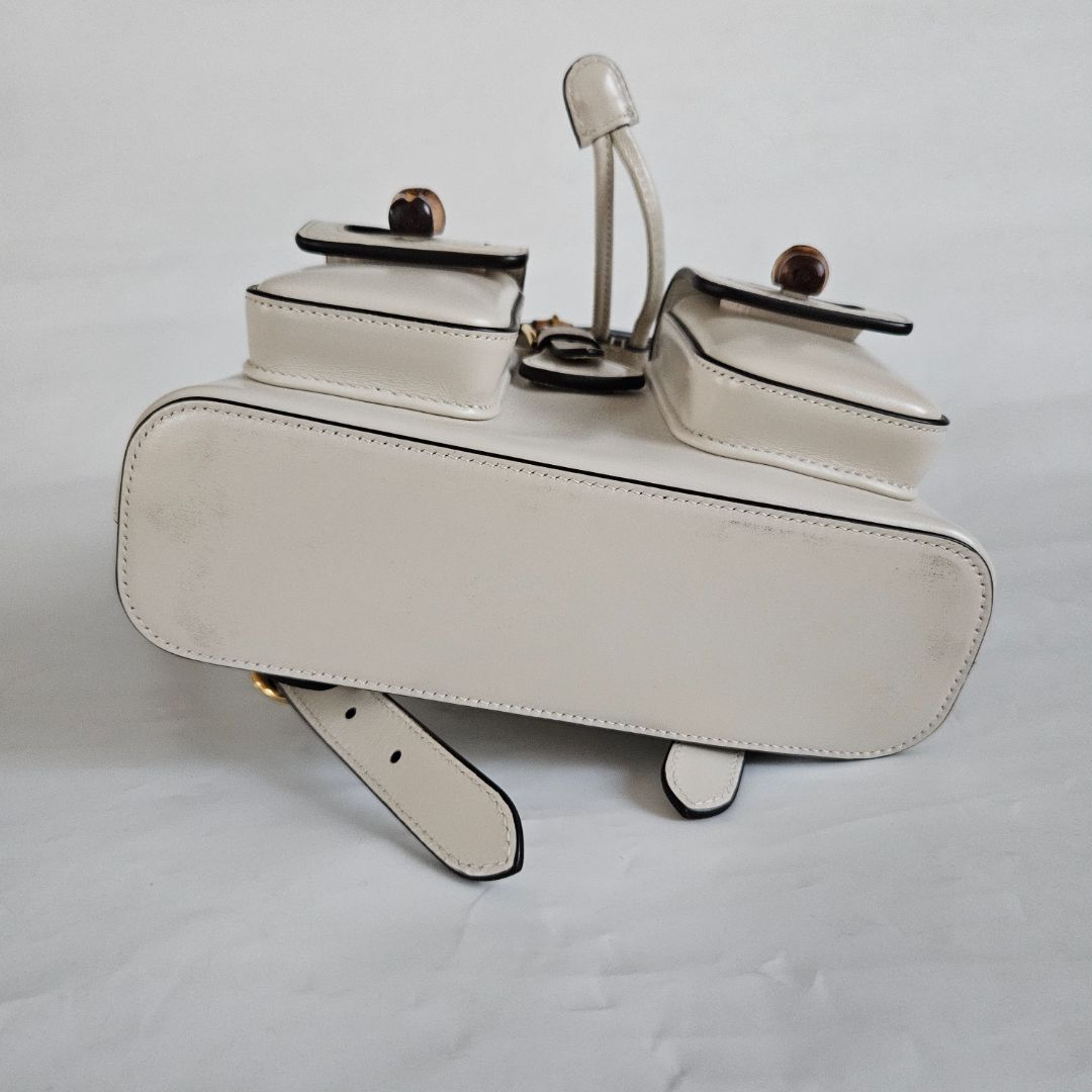 Crafted from soft, high-quality white leather, this elegant backpack features Gucci’s signature bamboo accents, including a bamboo top handle and turn-lock closure that add a distinctive, timeless charm.