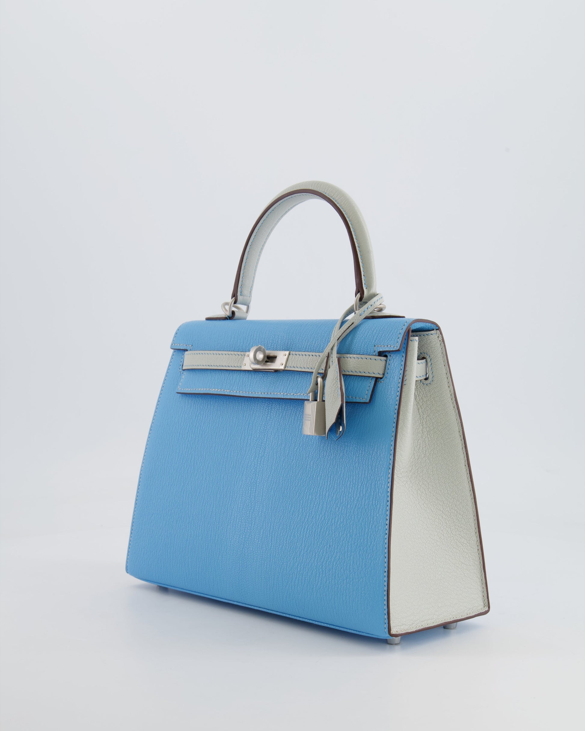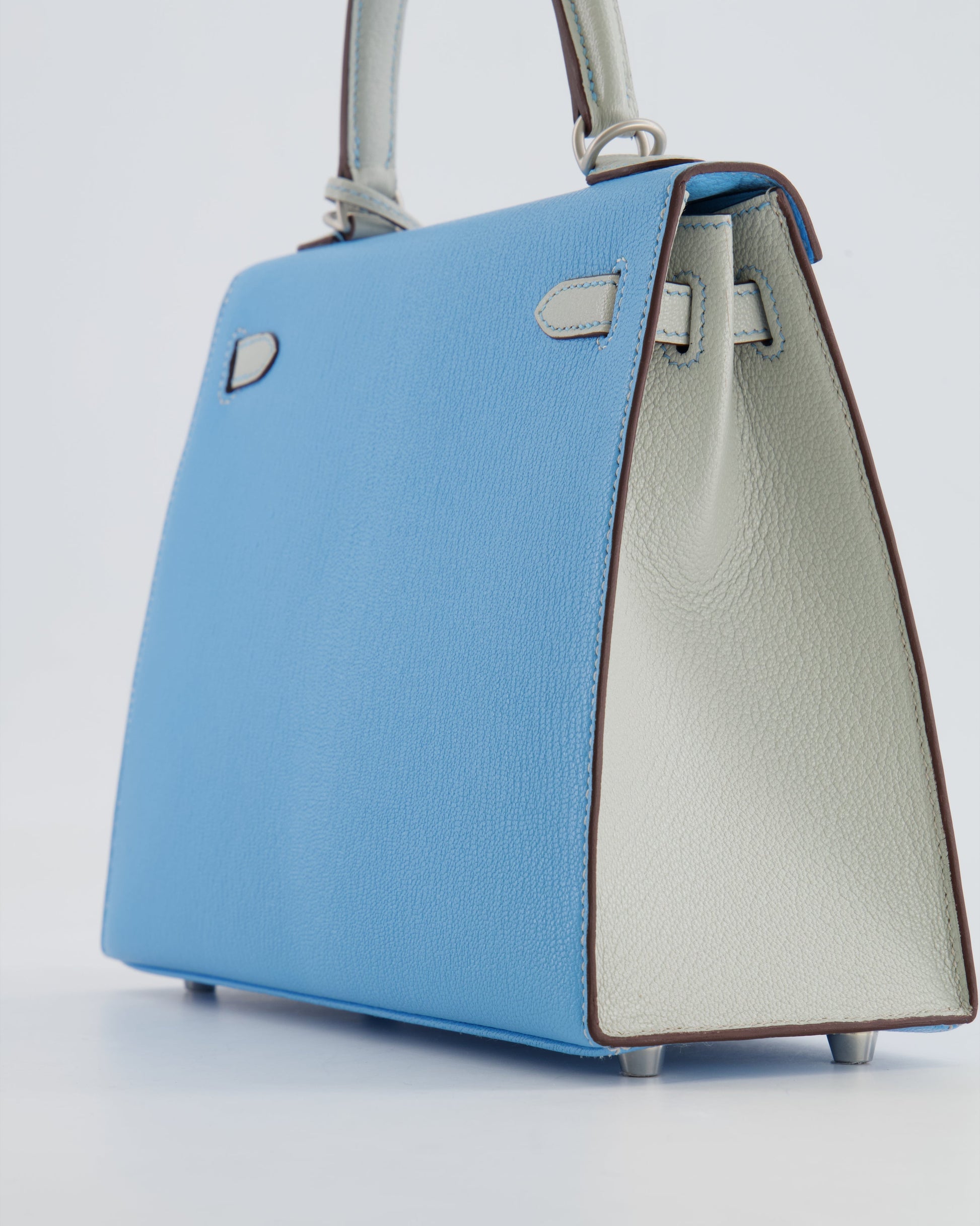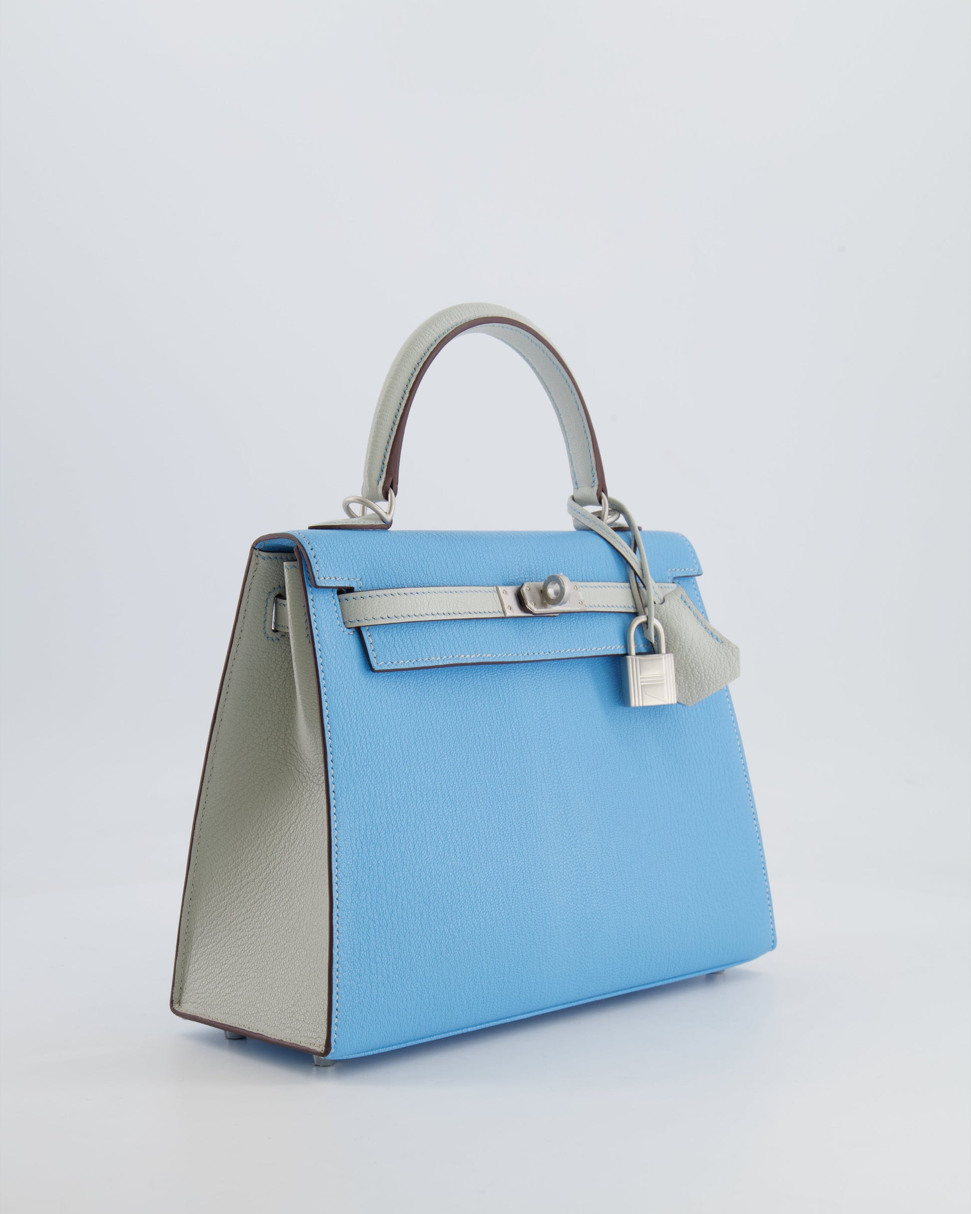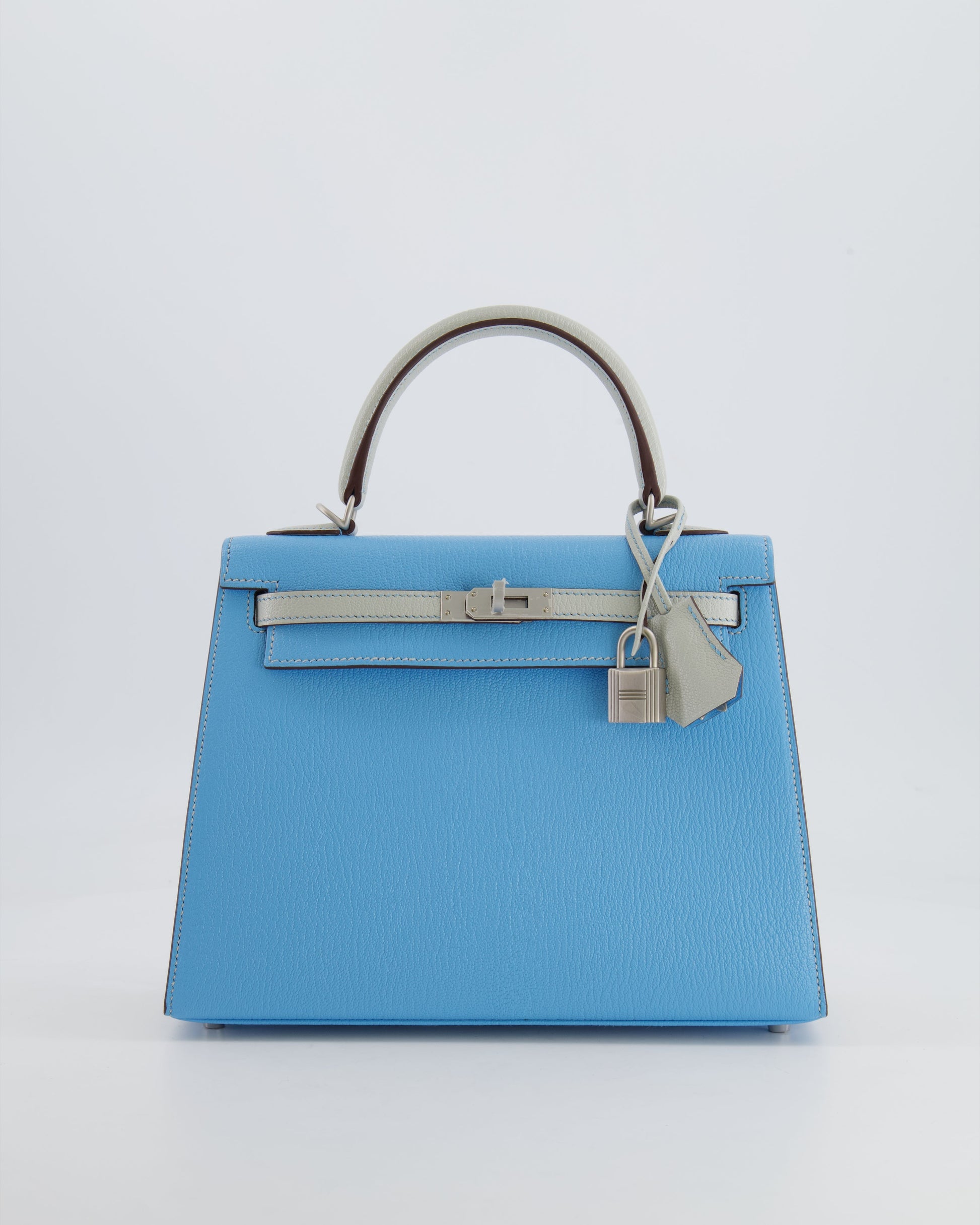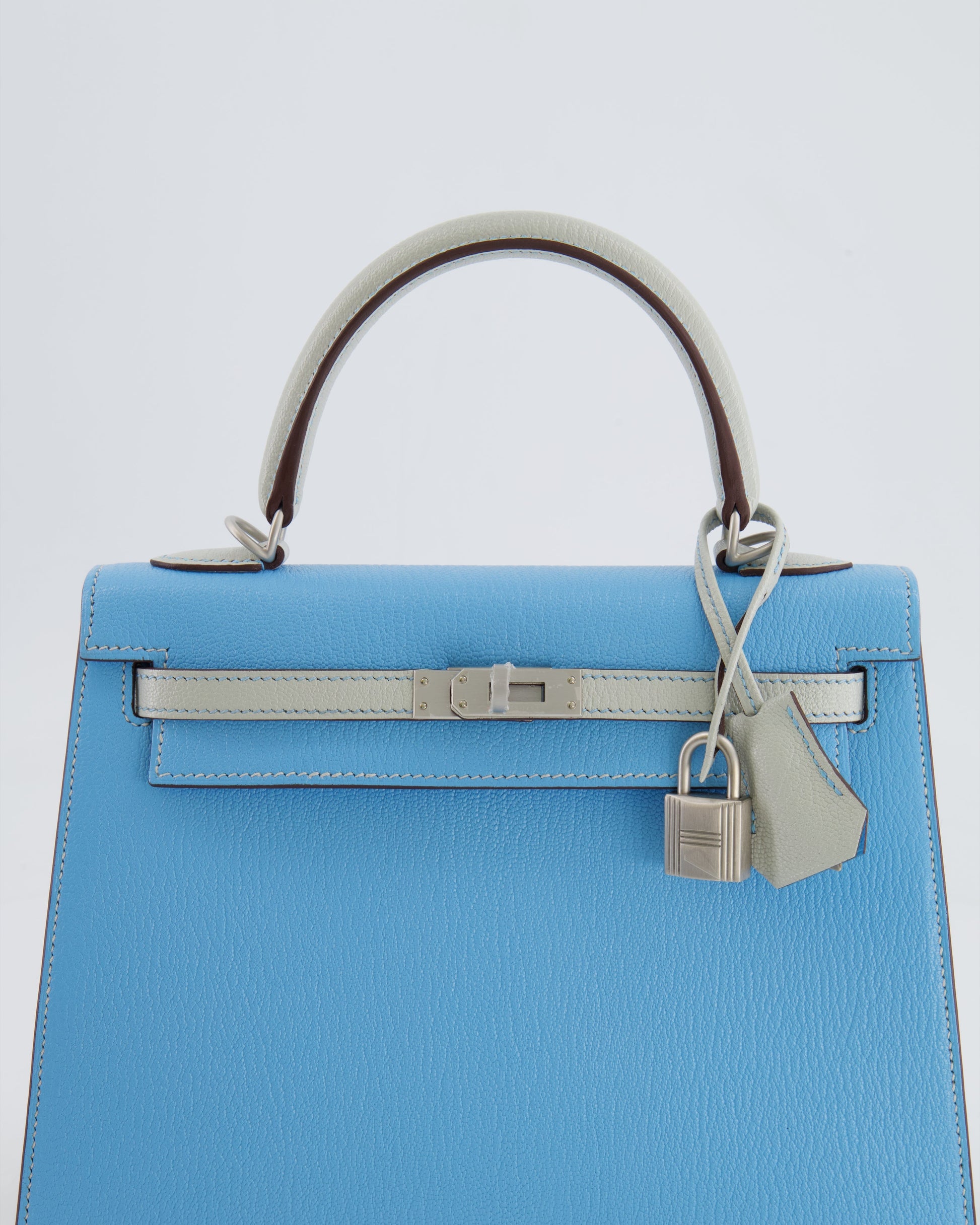 *VERY RARE* Hermès Kelly Sellier HSS 25cm Bag in Bleu Celeste and Gris Perle Chèvre Leather with Contrast Stitching and Brushed Palladium Hardware