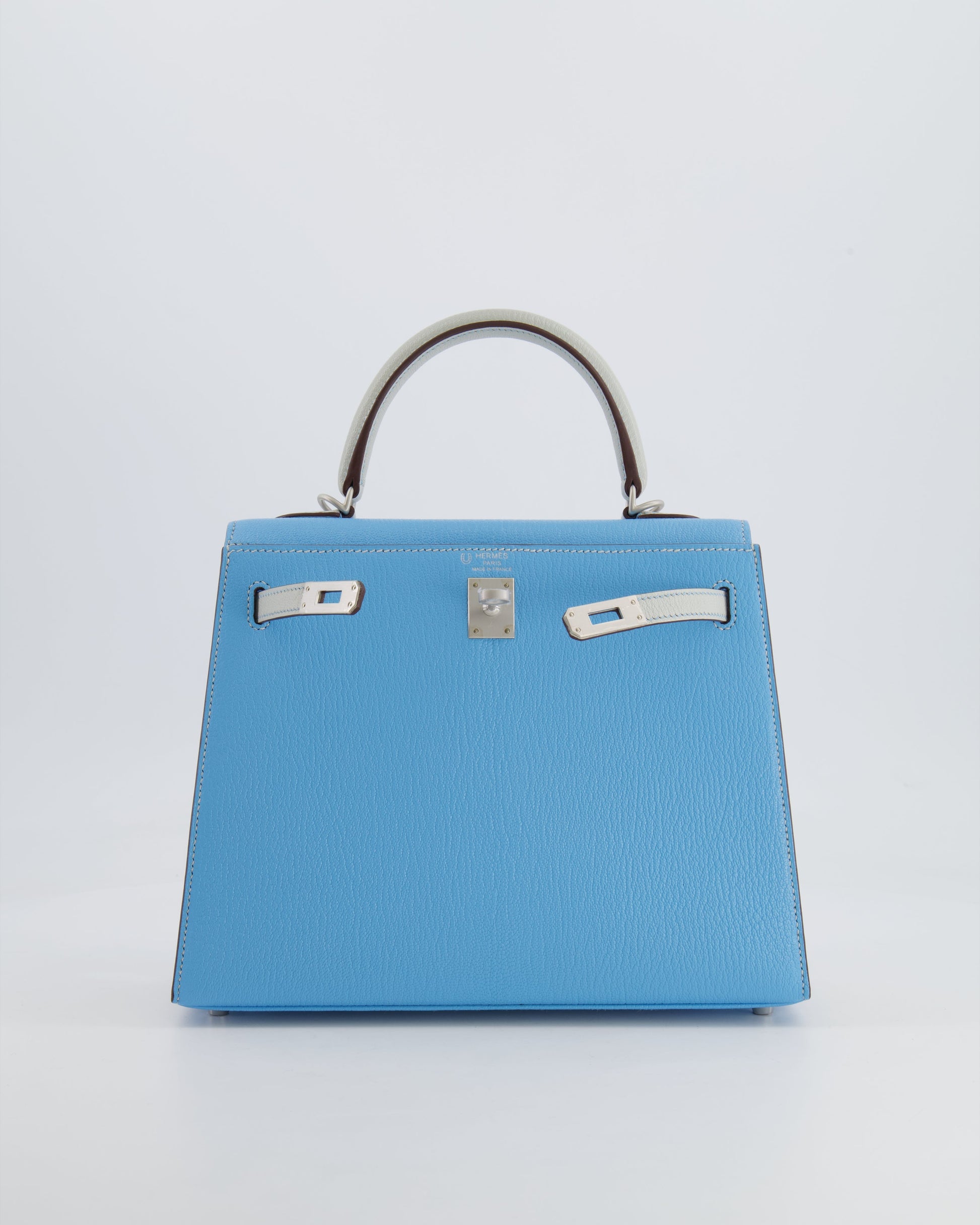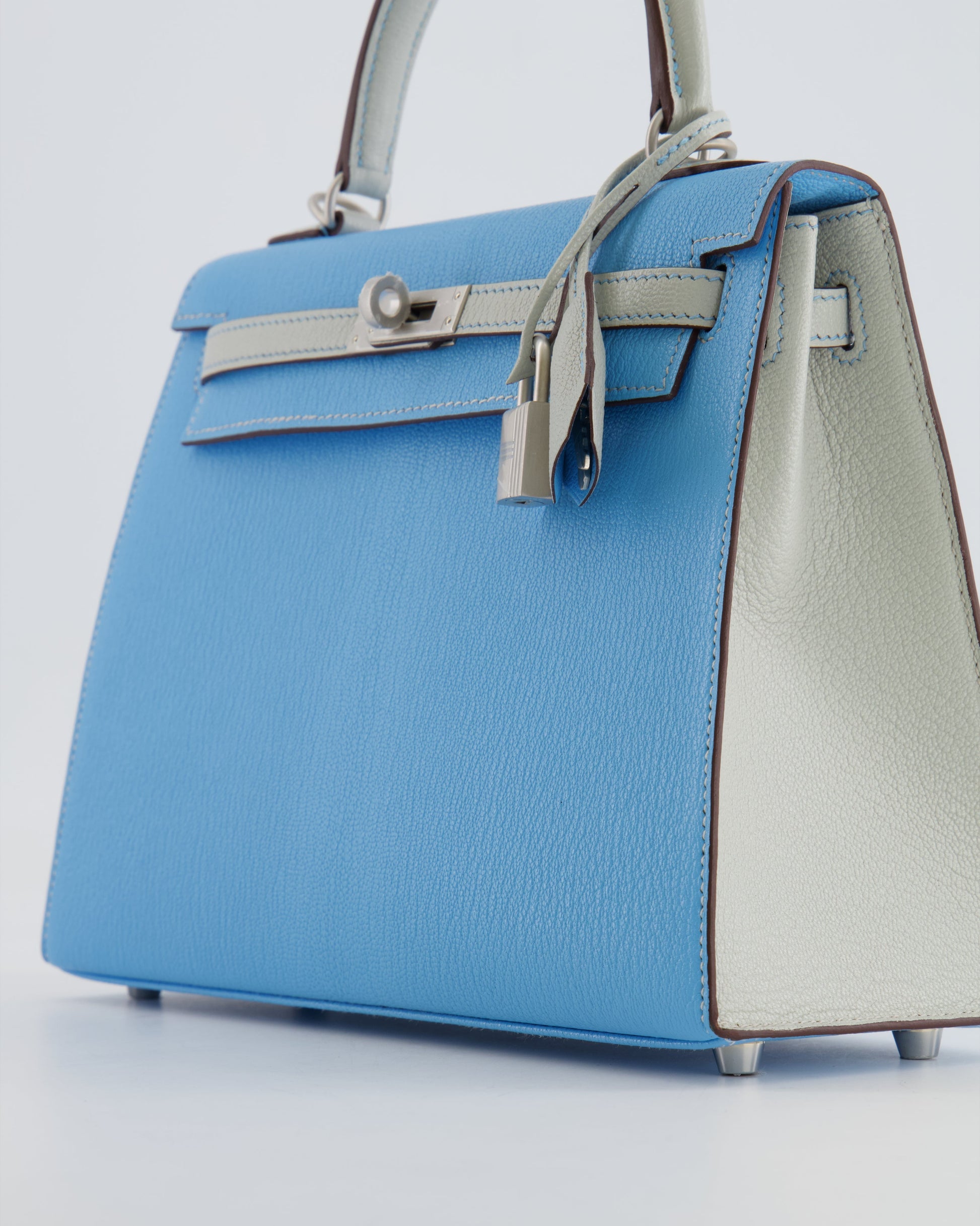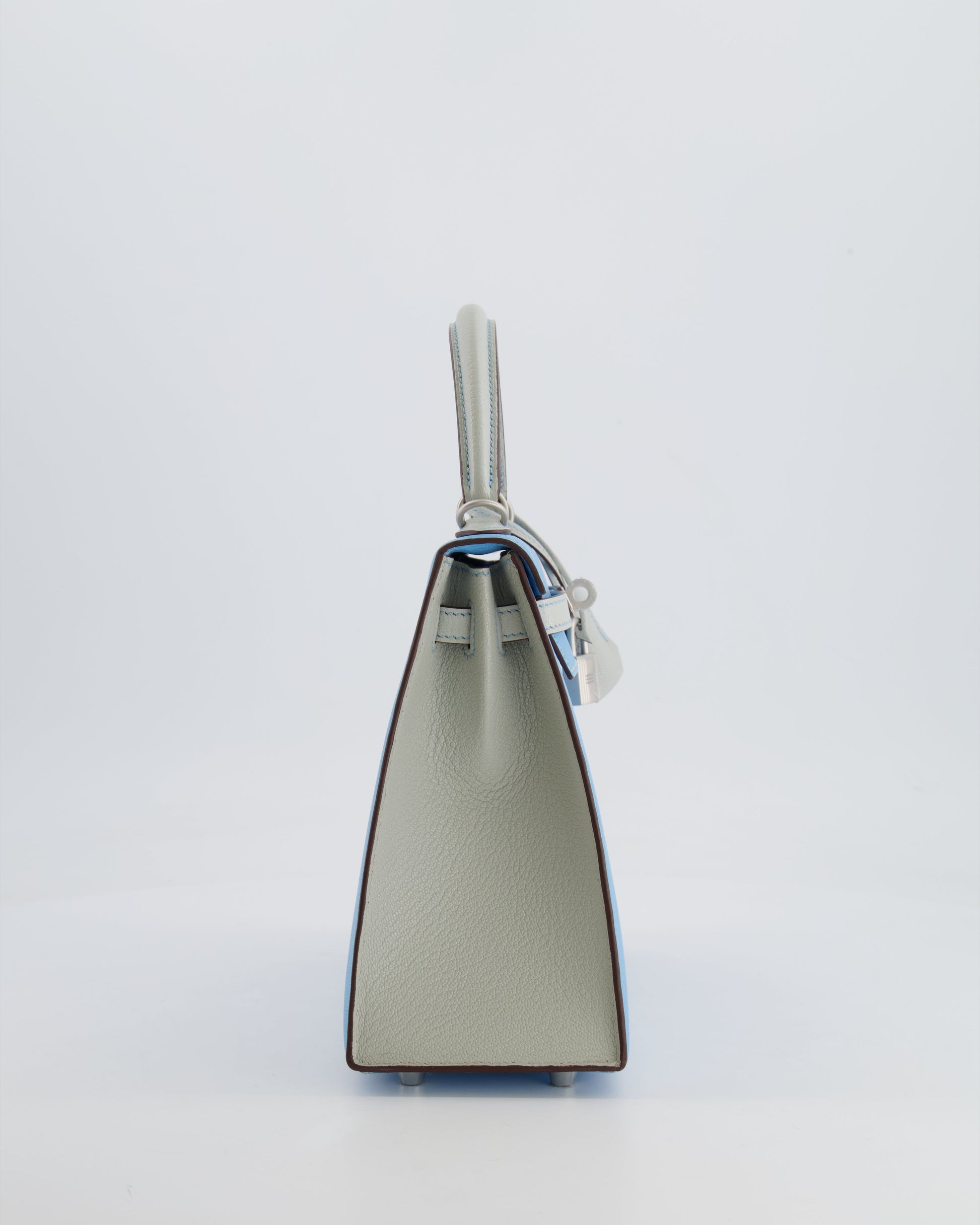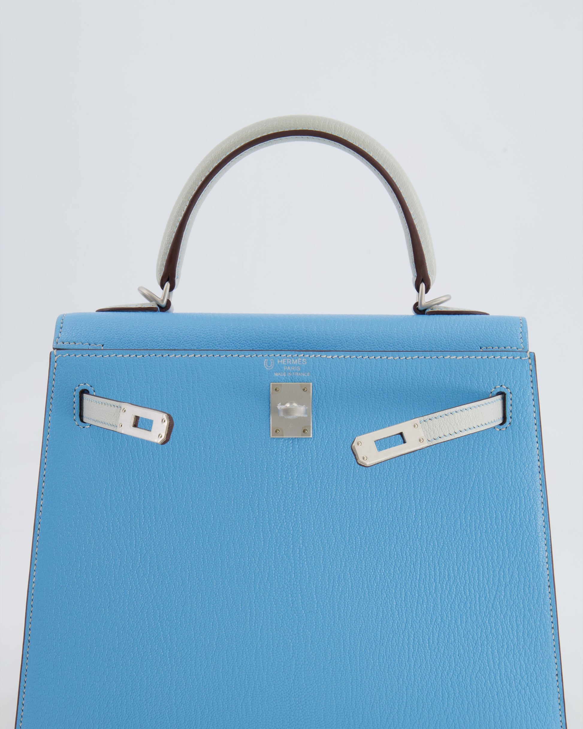 *VERY RARE* Hermès Kelly Sellier HSS 25cm Bag in Bleu Celeste and Gris Perle Chèvre Leather with Contrast Stitching and Brushed Palladium Hardware
