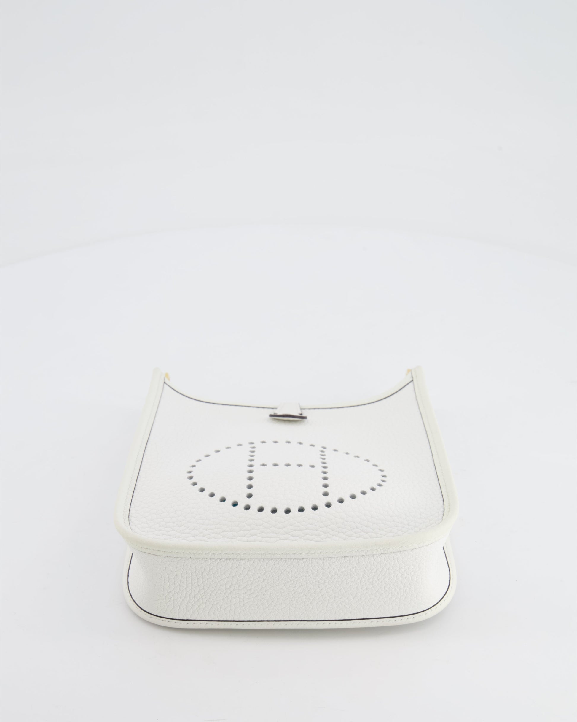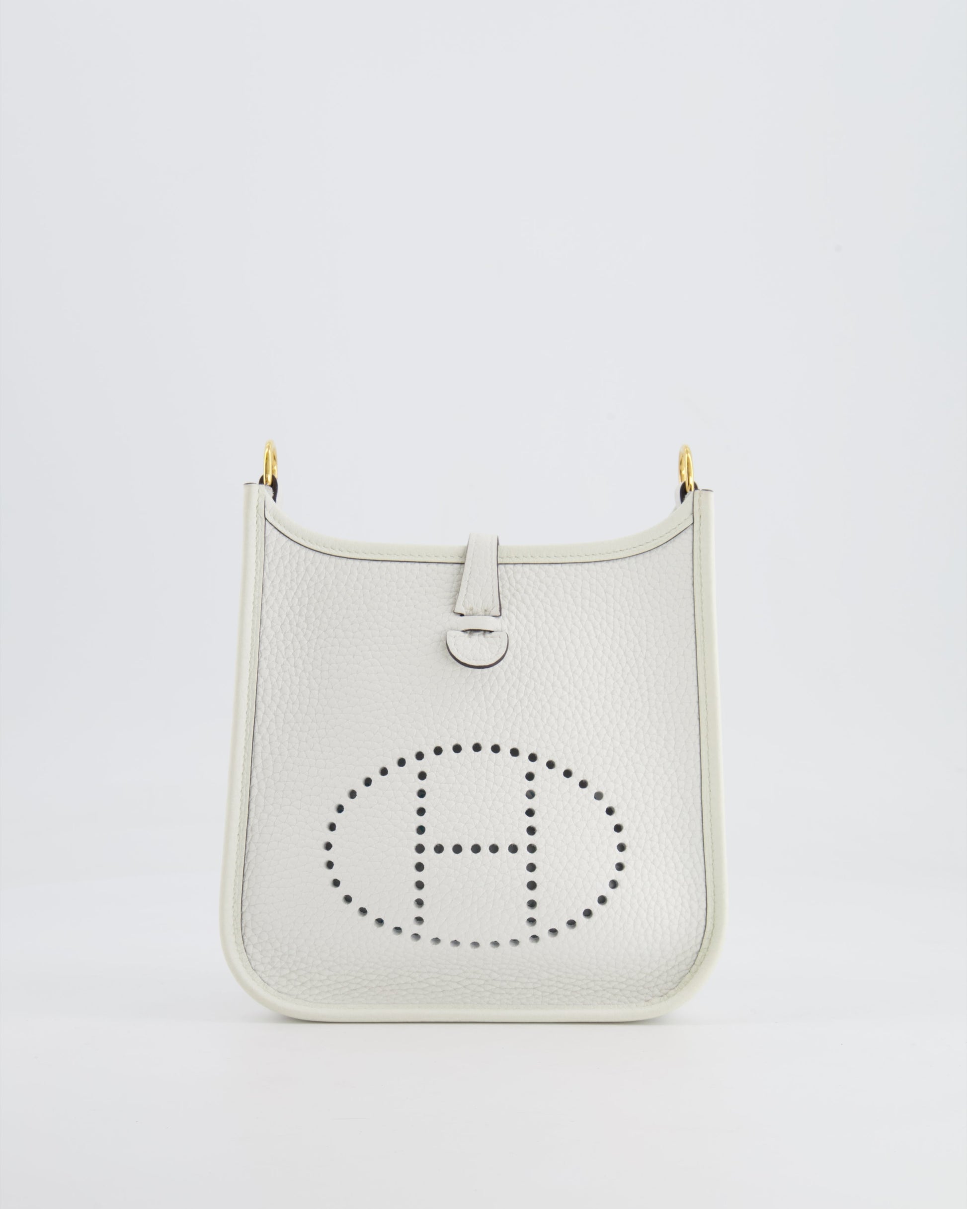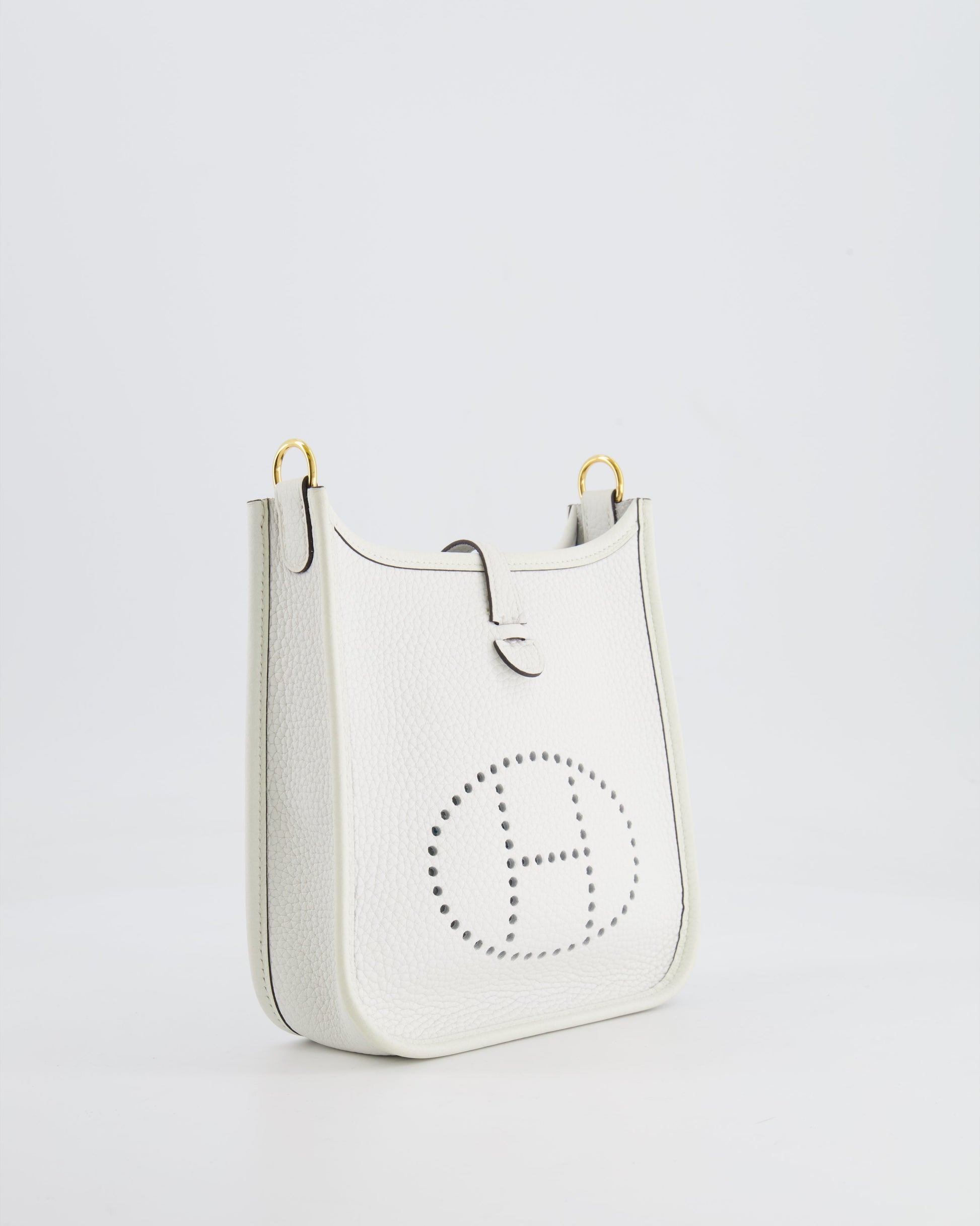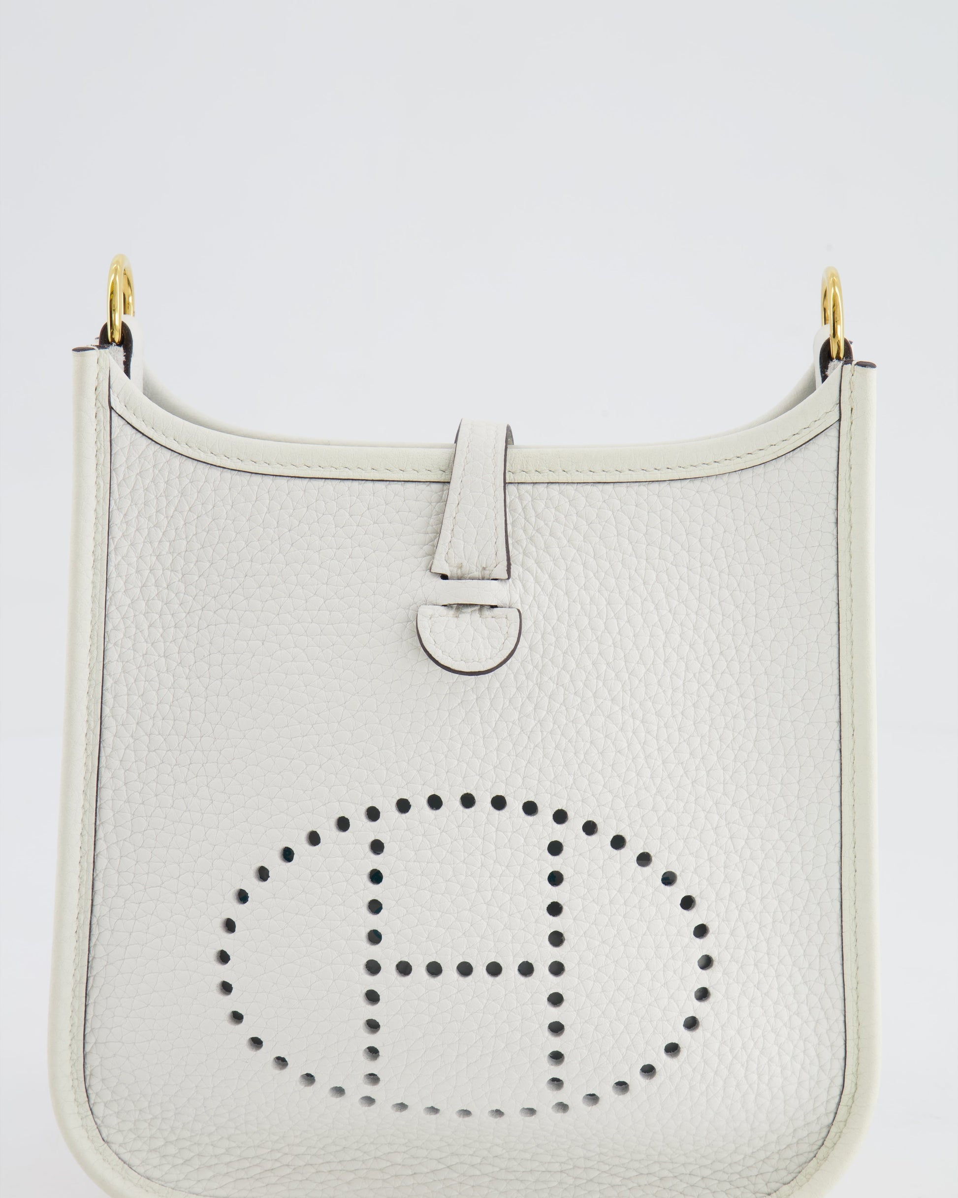 Hermès Mini Evelyne Bag in White Clemence Leather with Gold Hardware and White Canvas Strap