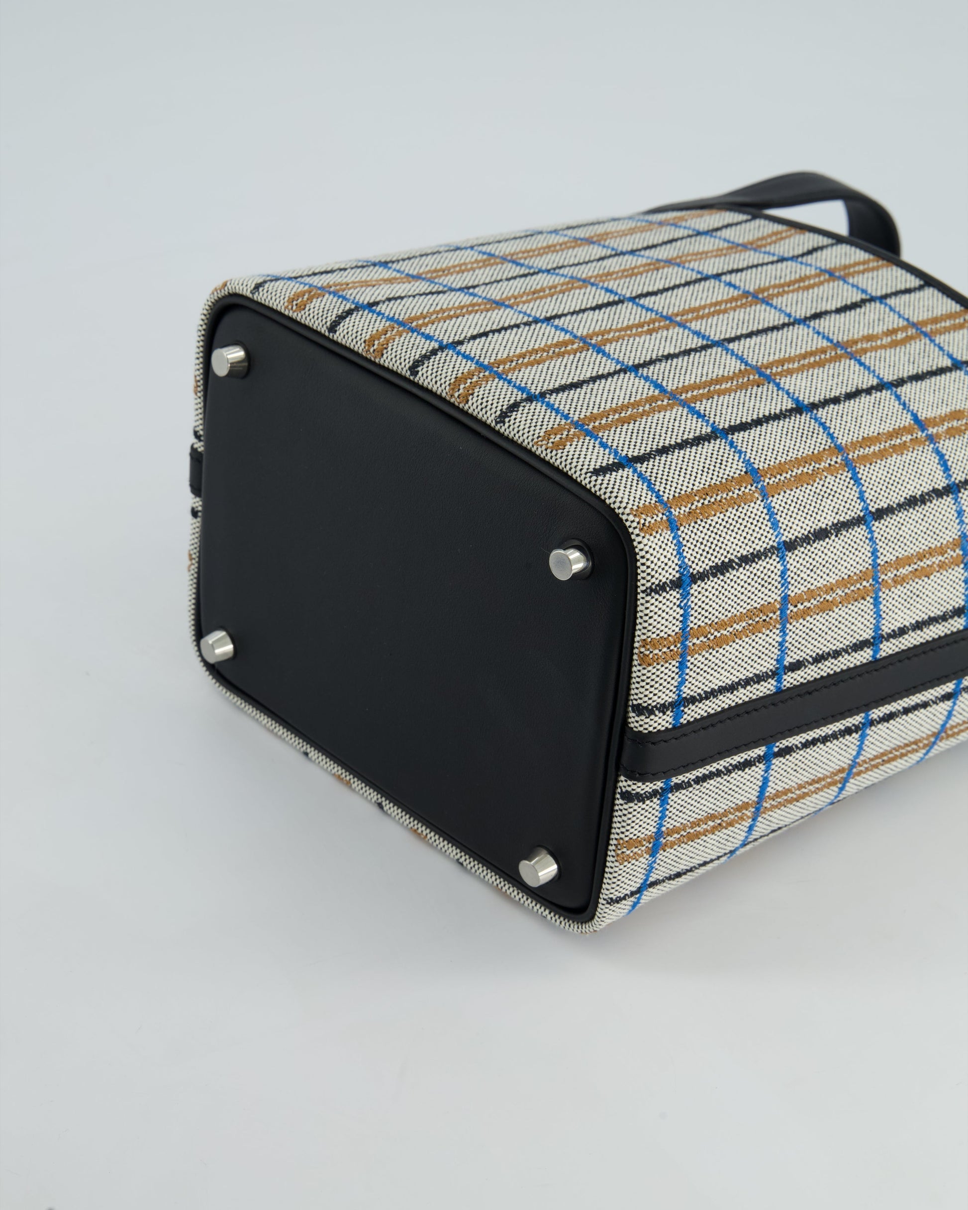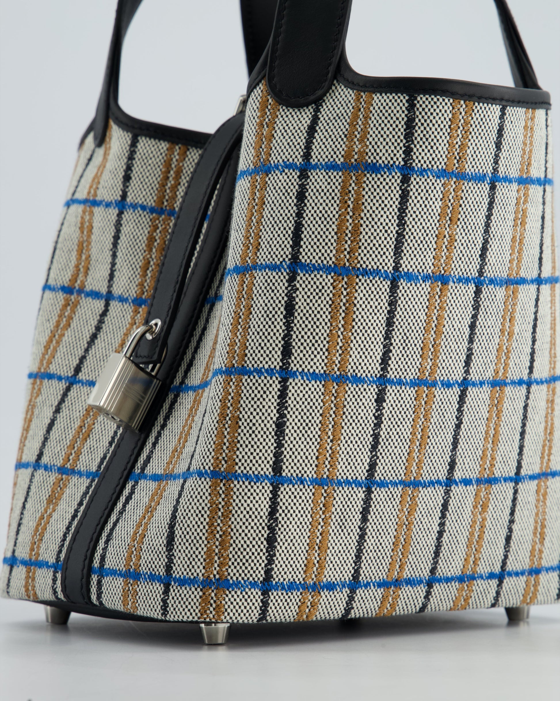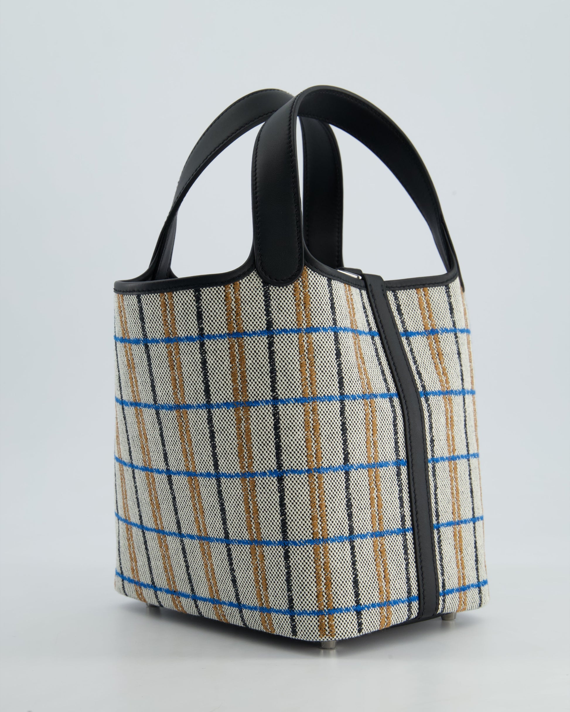 Hermes Picotin 18cm Broderie Couverture in Ecru, Noir, Fauve, Bleu Zanzibar Toile Canvas & Noir Swift Leather with Palladium Hardware