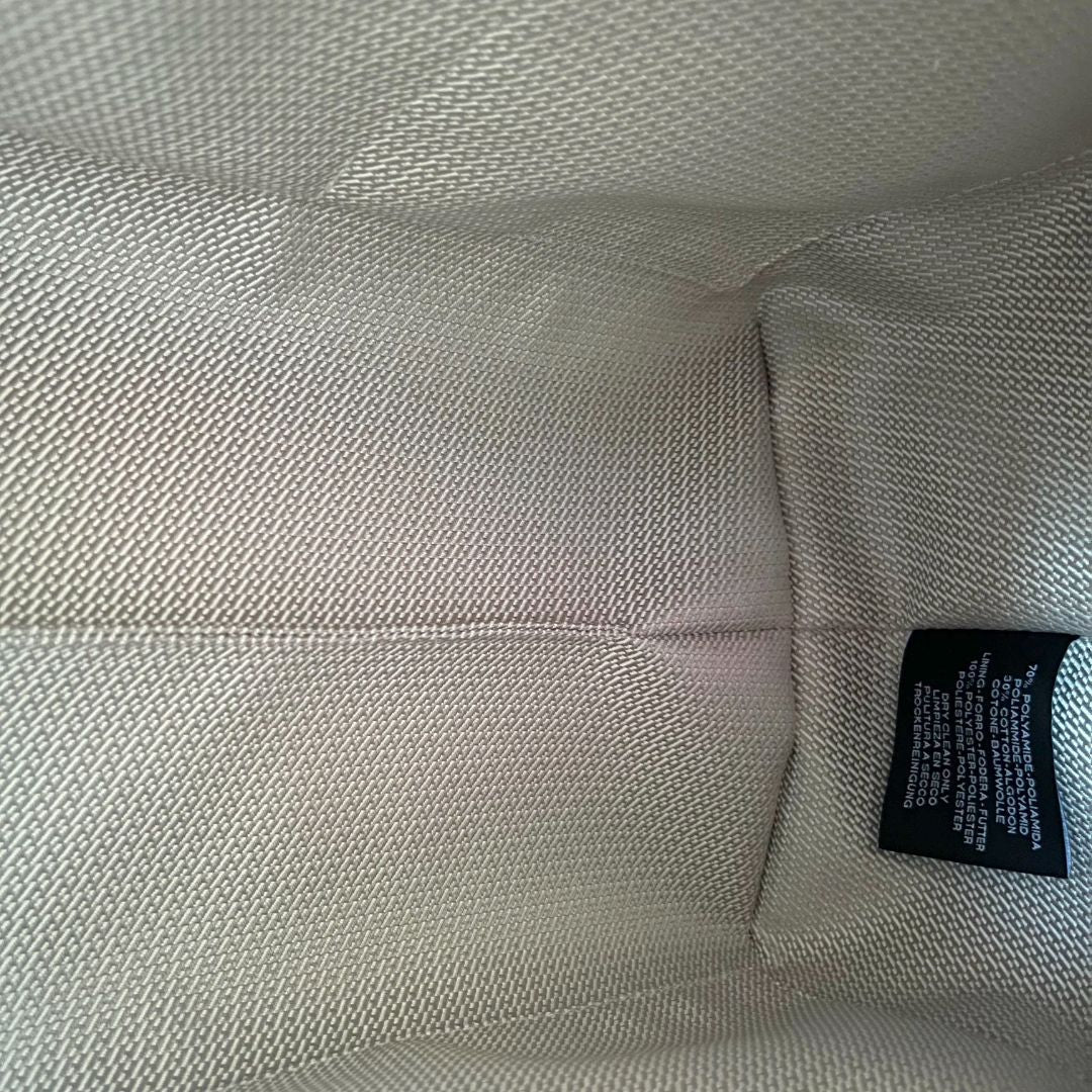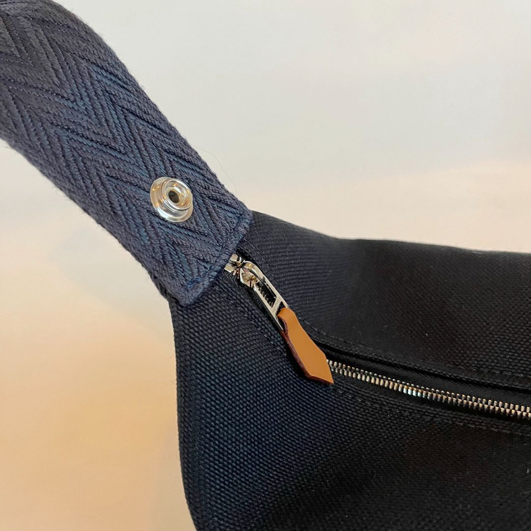 Hermes Bride-a-Brac GM Accessory pouch, The pouch is crafted of blue canvas and consists of a snap closure on the blue top handle, along with a blue stripe around the bag. The palladium silver top zipper opens to a beige fabric interior with pockets.