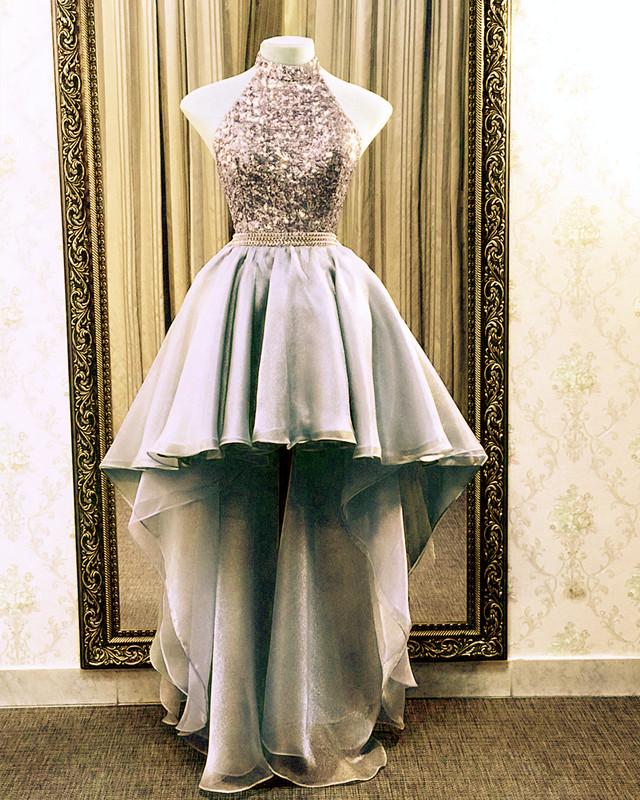 High Low Sequin Organza Prom Dresses Halter Backless Formal Evening Party Gown Dress SA1679
