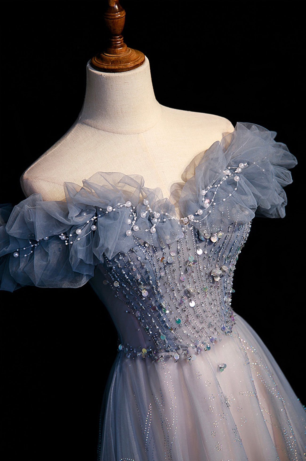 The High-Quality Tulle Long Prom Dress with Beaded accents is a stunning choice for your evening party or prom. Its A-line silhouette and intricate beadwork create an elegant and eye-catching look.