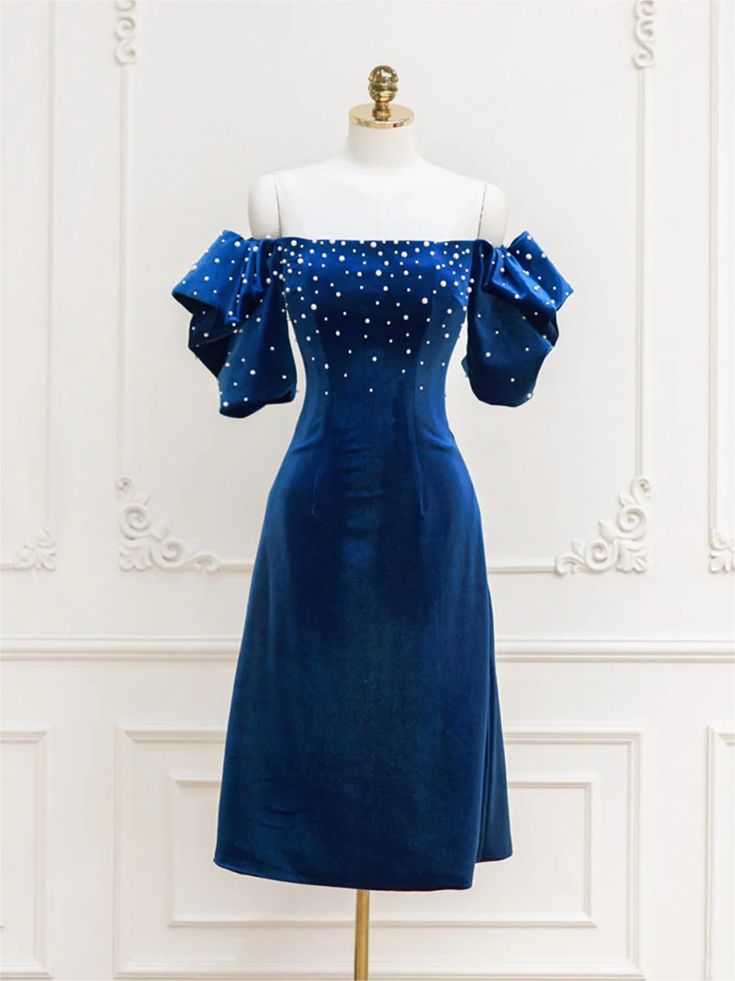 Homecoming Dresses,blue Velvet Beads Short Prom Dress, Blue Cocktail Dress fg6425