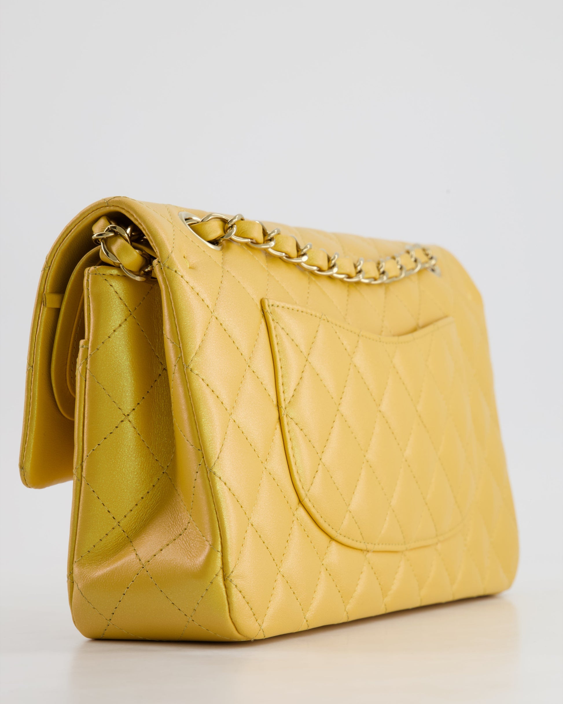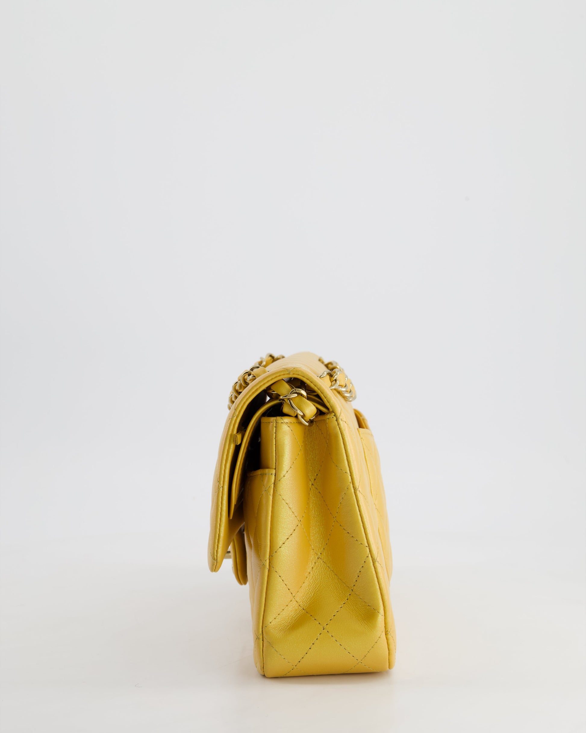 *HOT* Chanel Iridescent Mustard Yellow Medium Double Flap Bag in Lambskin Leather with Champagne Gold Hardware