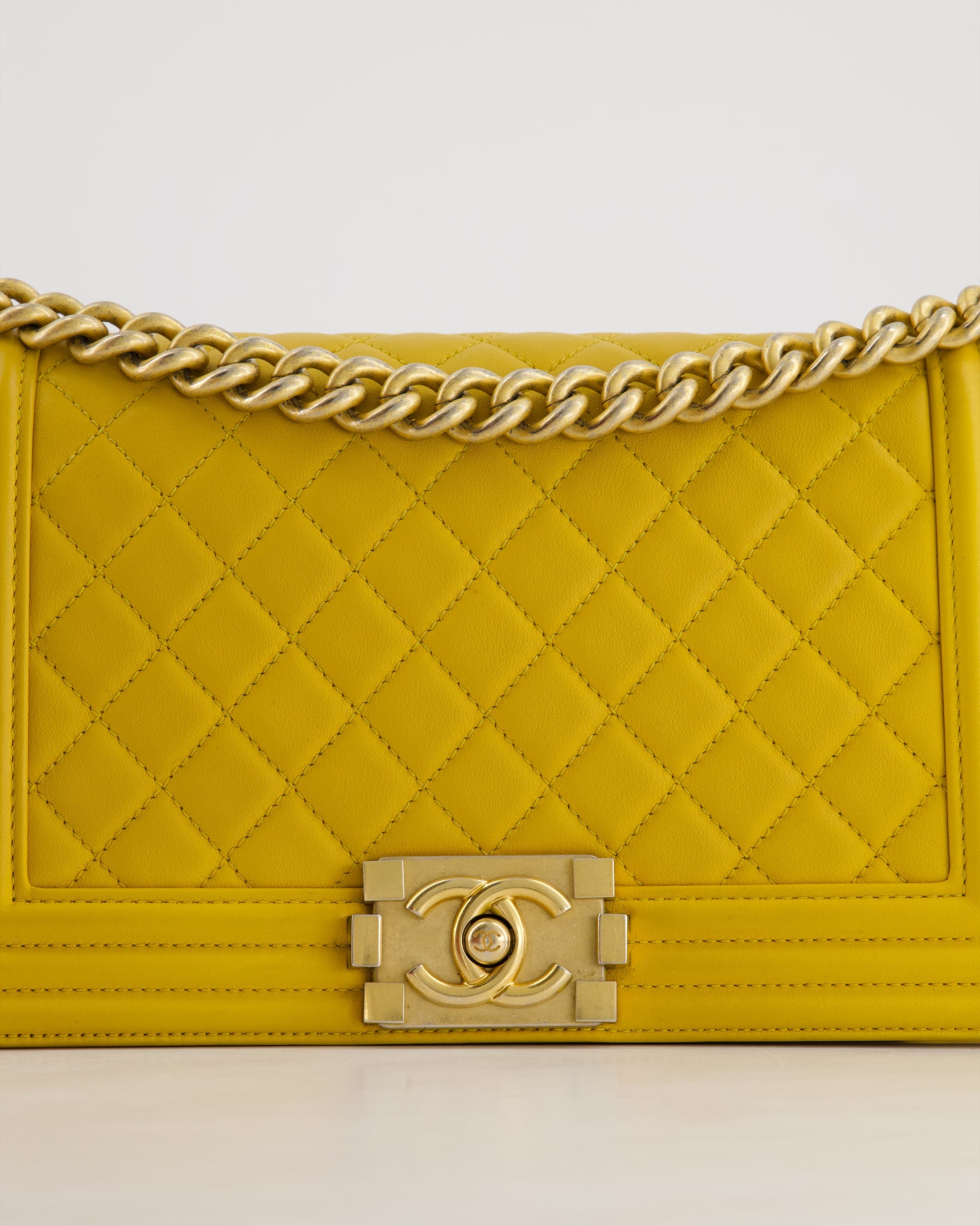 Chanel Mustard Yellow Medium Boy Bag in Calfskin Leather with Antique Gold Hardware