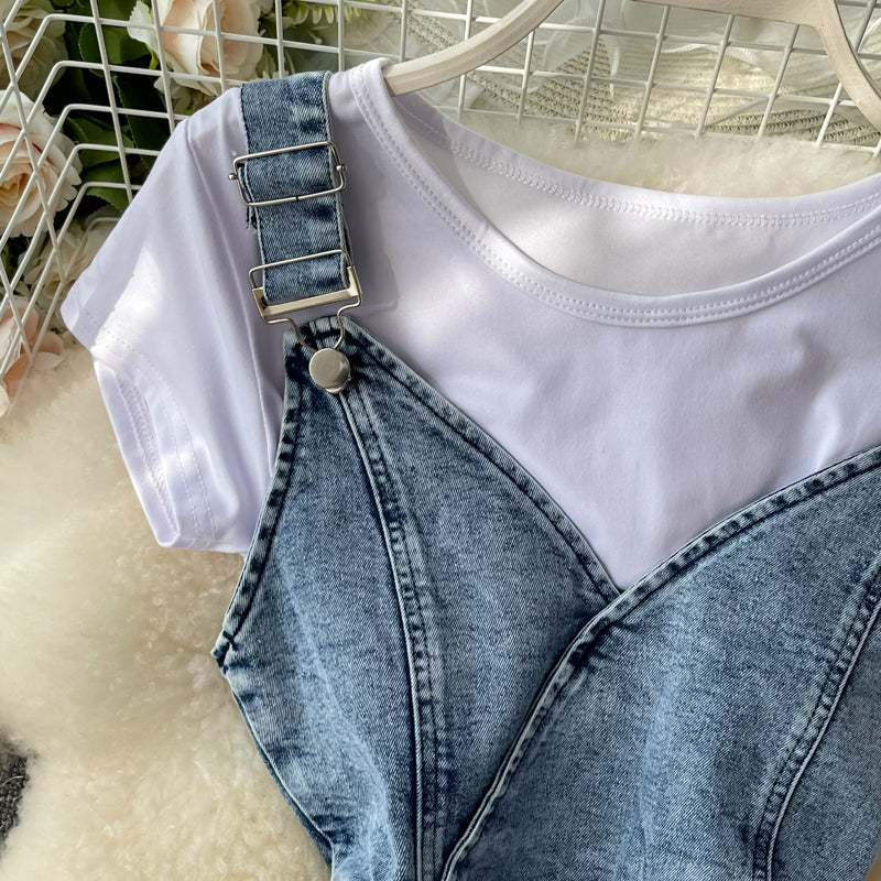 Irregular ruffled fishtail strap skirt denim dress two piece set 3064