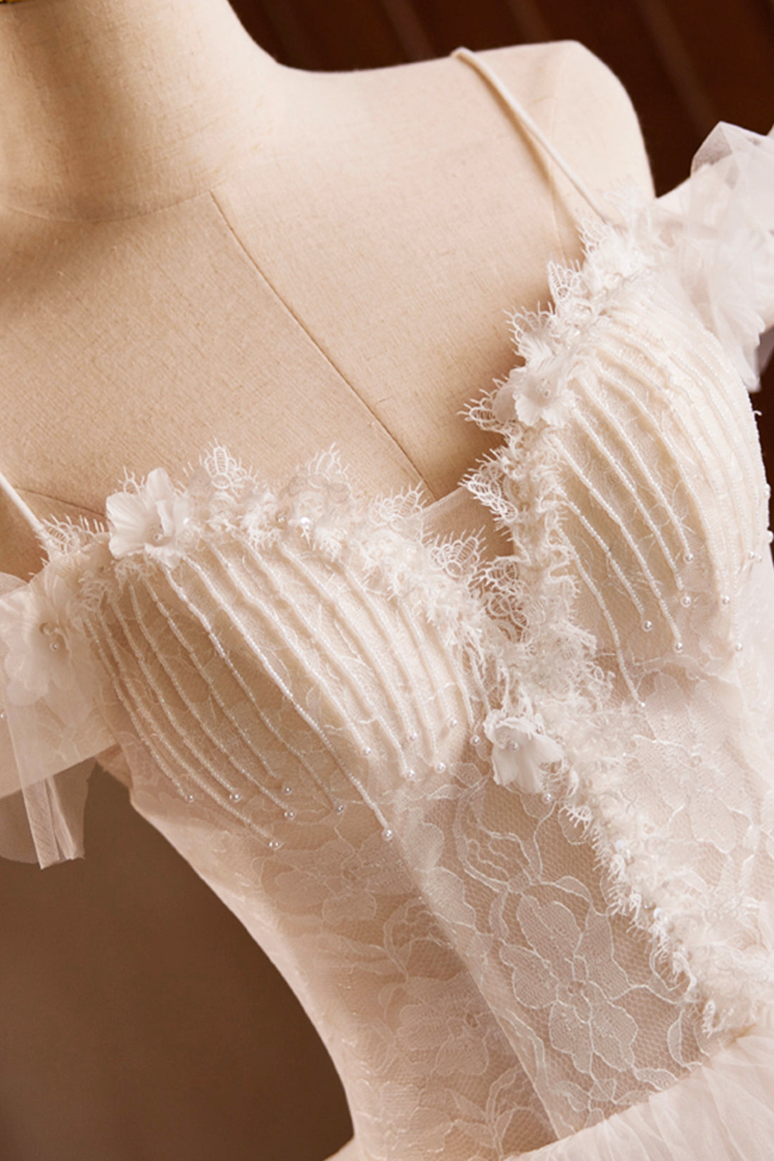 Choose the Ivory Spaghetti Strap Lace Beaded Party Dress for a stunning and memorable night. Its lace detailing and A-line charm make it a standout choice for any evening occasion.