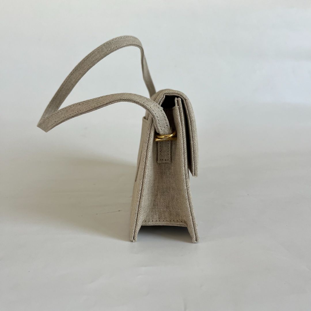Jacquemus Le Grand Bambino woven-blend top-handle bag, rectangular shape, top handle, flap front, brand design plaque at front, slip pocket at back, all over canvas texture, gold-toned hardware, one main compartment fully lined
