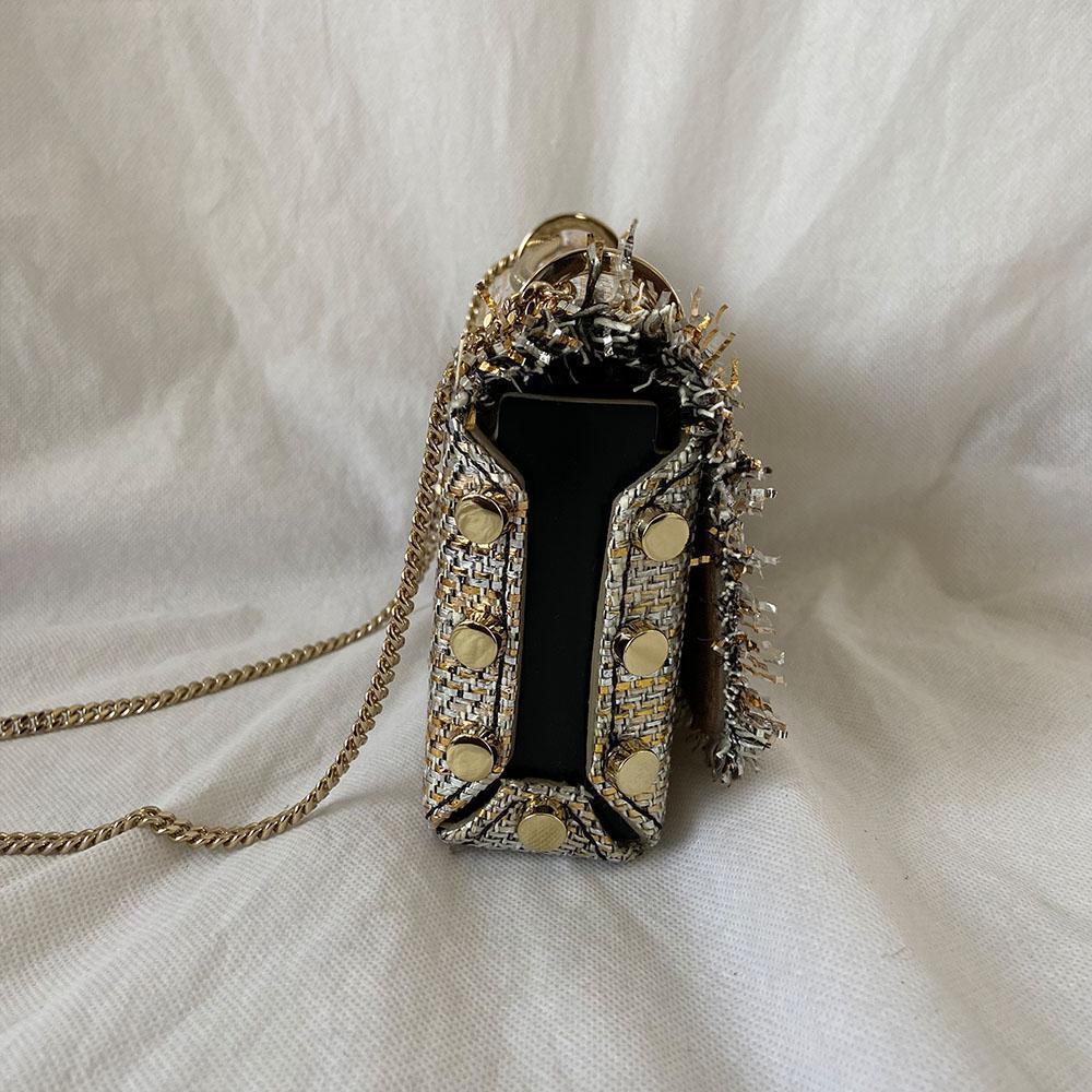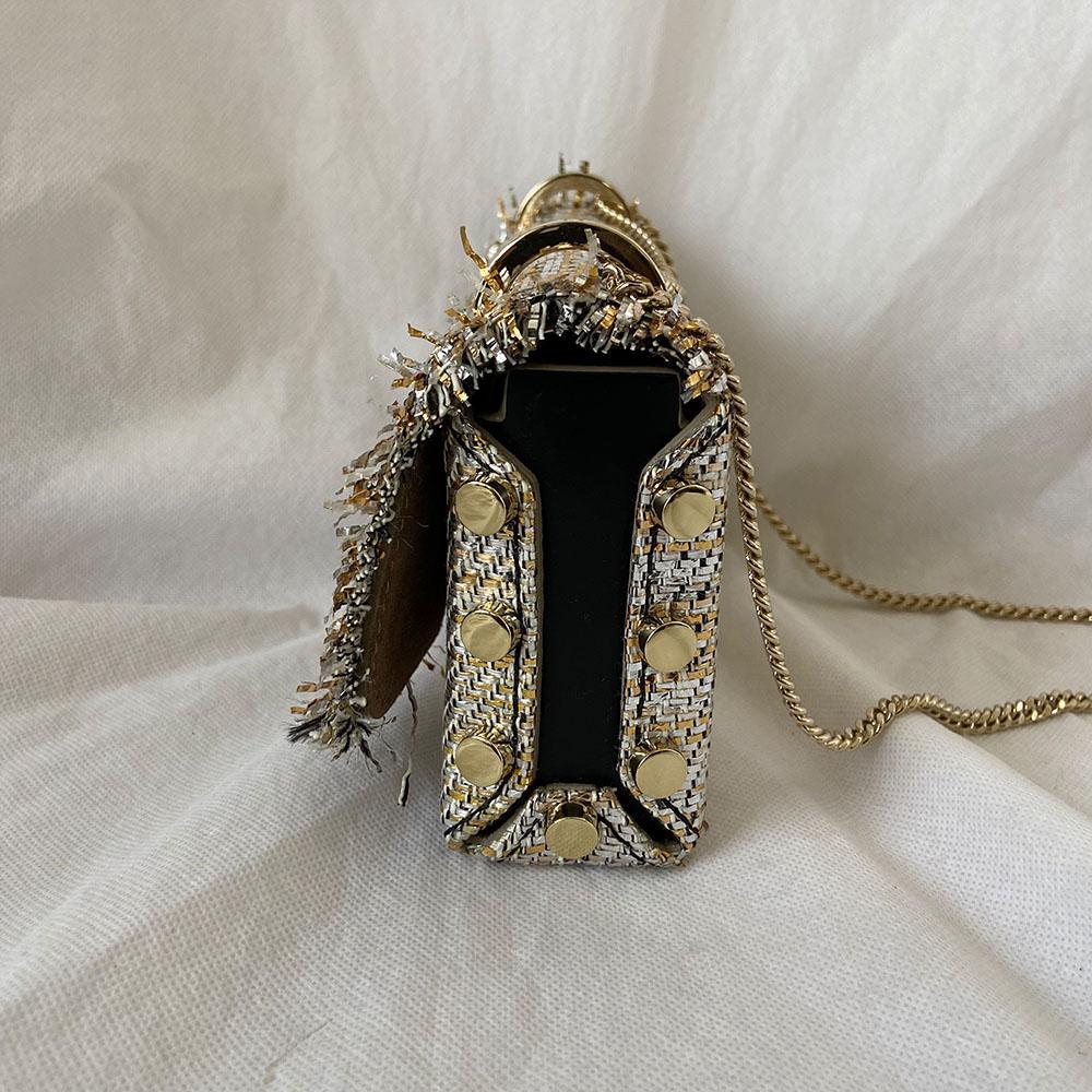Description : Featuring frayed metallic tweed, detailed bag boasts a unique pave crystal lock closure, designed to stay firmly and securely closed. Frayed metallic tweed, adjustable chain strap with knot Interior embossed Jimmy Choo logo 1 main compartment bag