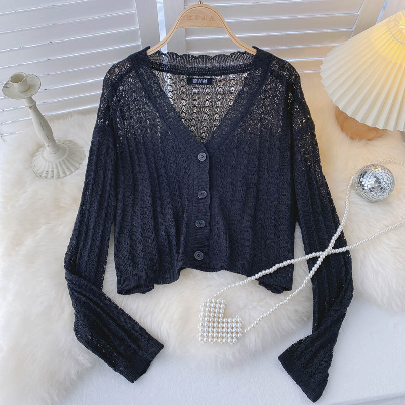 Knitted cardigan thin hook flower hollow out long sleeve 1583