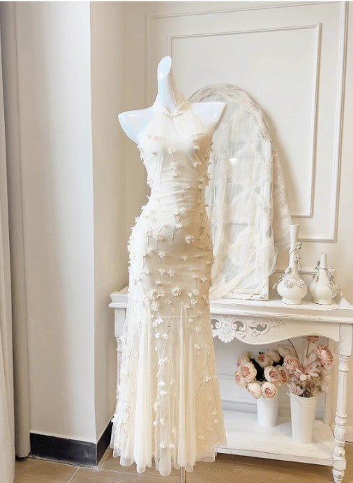 Light Apricot Mermaid Turtleneck Tulle 3D Flower Prom Dress ED01755