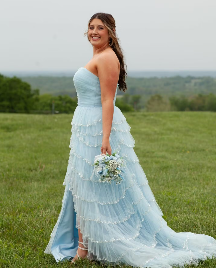 Light Blue Strapless Layered Tulle Prom Dress with Sequins ED01359