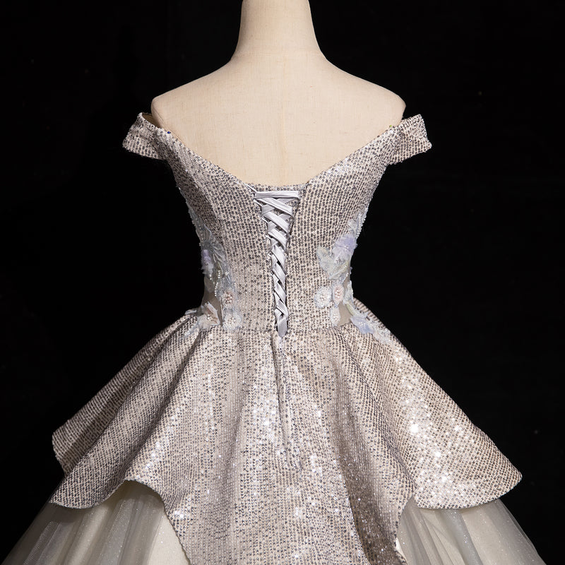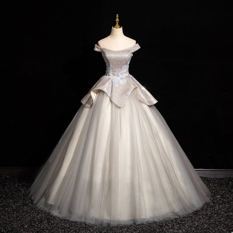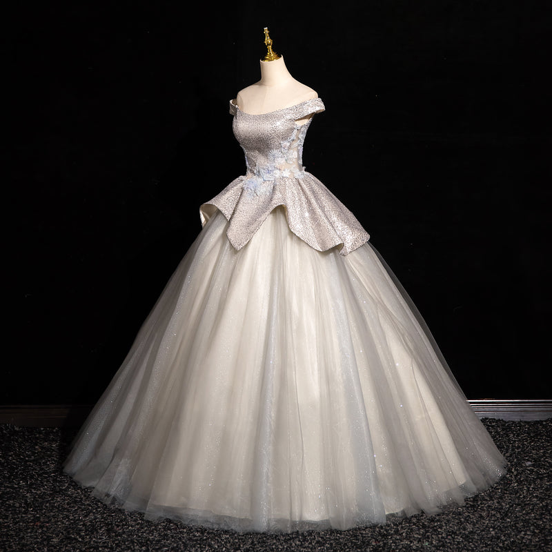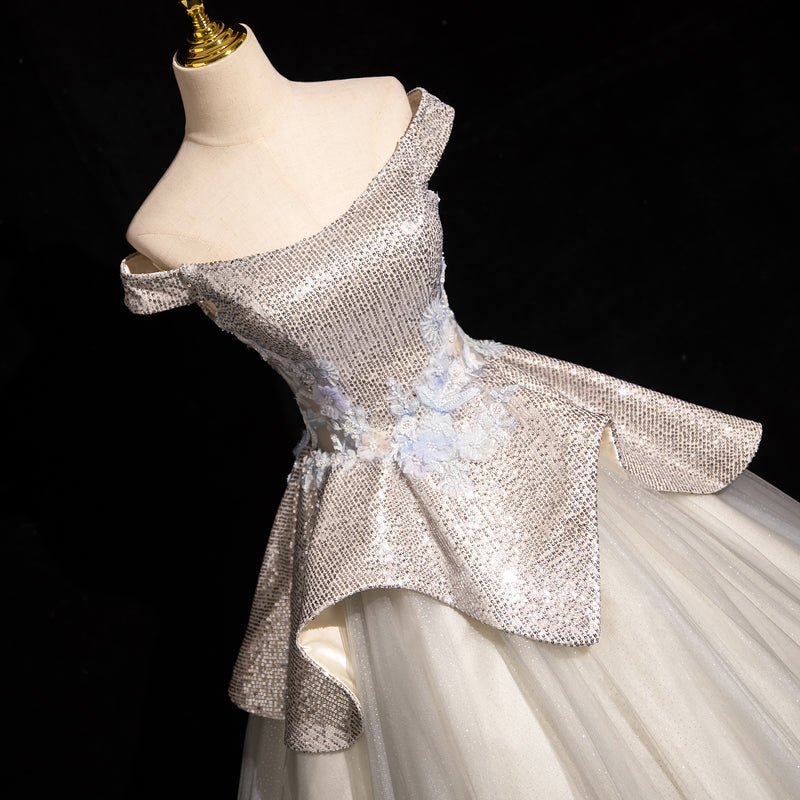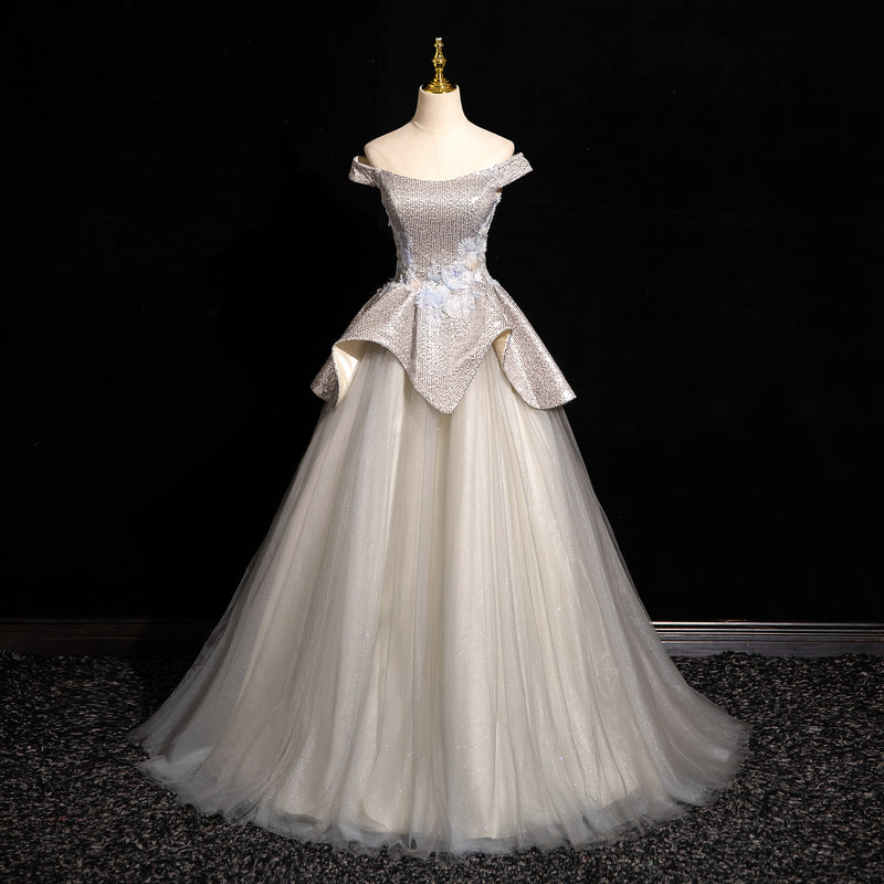 Light Grey A-line Off-shoulder Neck Sequin Tulle Long Prom Dress, Elegant Formal Dress ED01231