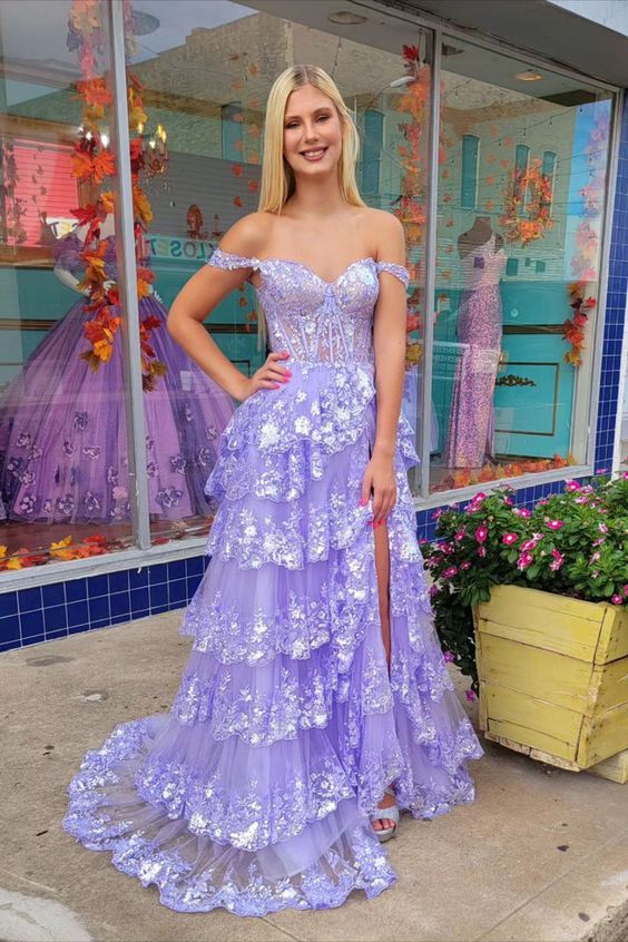 Lilac Lace Sweetheart Tiered Long Prom Dress with Slit fg4212