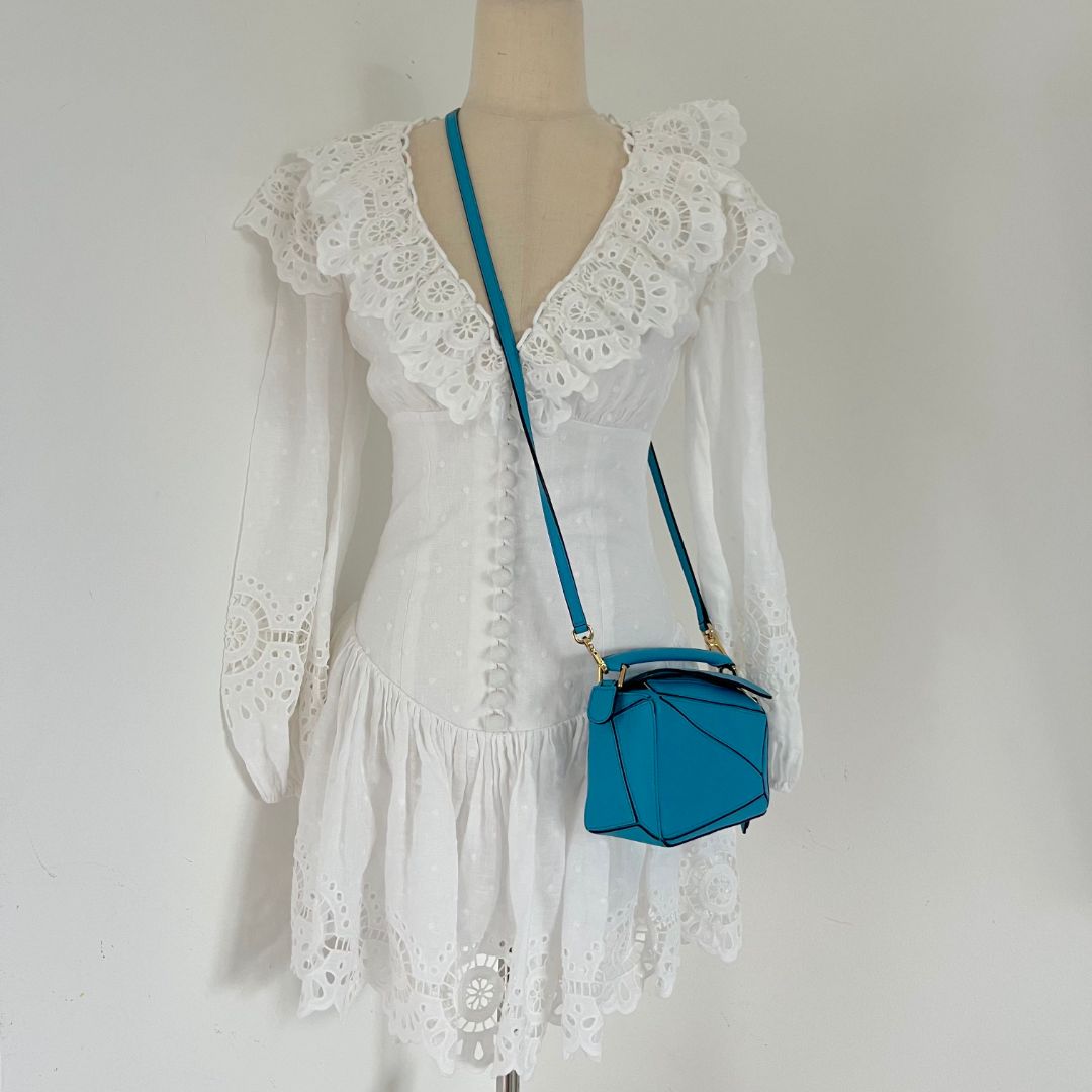 Loewe mini puzzle bag in vibrant blue textured leather, comes with removable strap and a dust bag