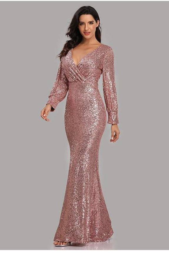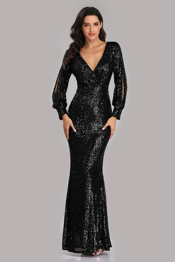 loveedsTM-Long Sleeve V Neck Sequined Fishtail Evening Dress