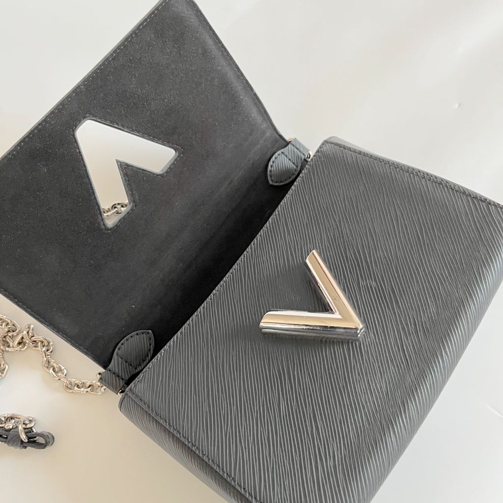 Louis Vuitton black epic leather MM twist bag with silver-tone hardware. Interior lined with black suede