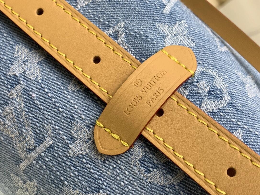 Made from 100% organic cotton, this Carryall PM in Monogram Denim is part of the LV By The Pool Collection. The stonewashed treatment of the light-blue and white Monogram gives the bag a casual elegance. The design includes a matching, removable pouch and three inside pockets. The strap adjusts for hand, shoulder, or cross-body carry.