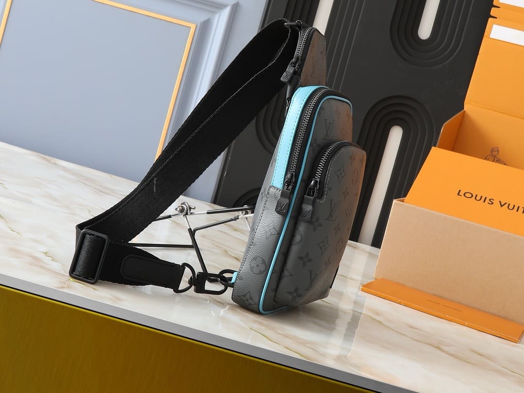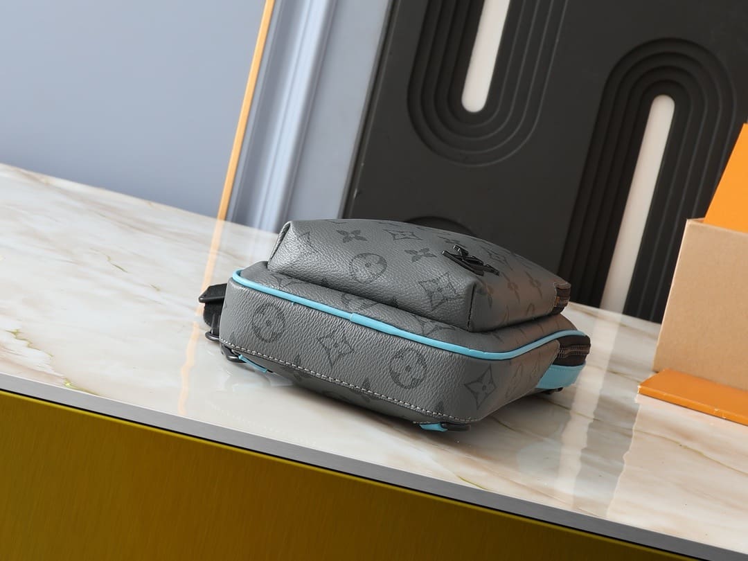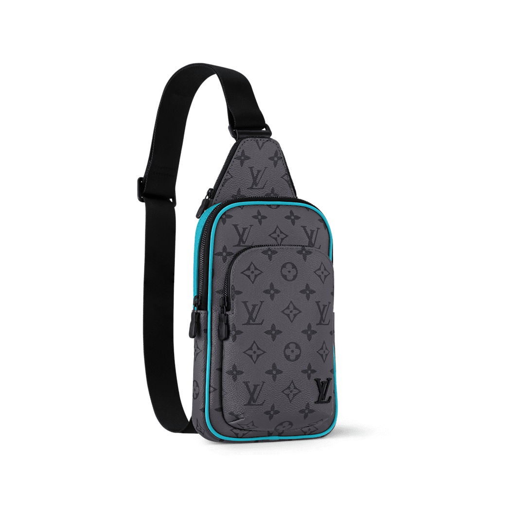 The Avenue Slingbag PM is made from Monogram Eclipse Reverse canvas, with turquoise-color leather trim. An alternative to the classic backpack, this cross-body bag features a zipped main compartment and a roomy front zipped pocket. And for those smaller items, there’s a triangular pocket where the strap meets the bag.