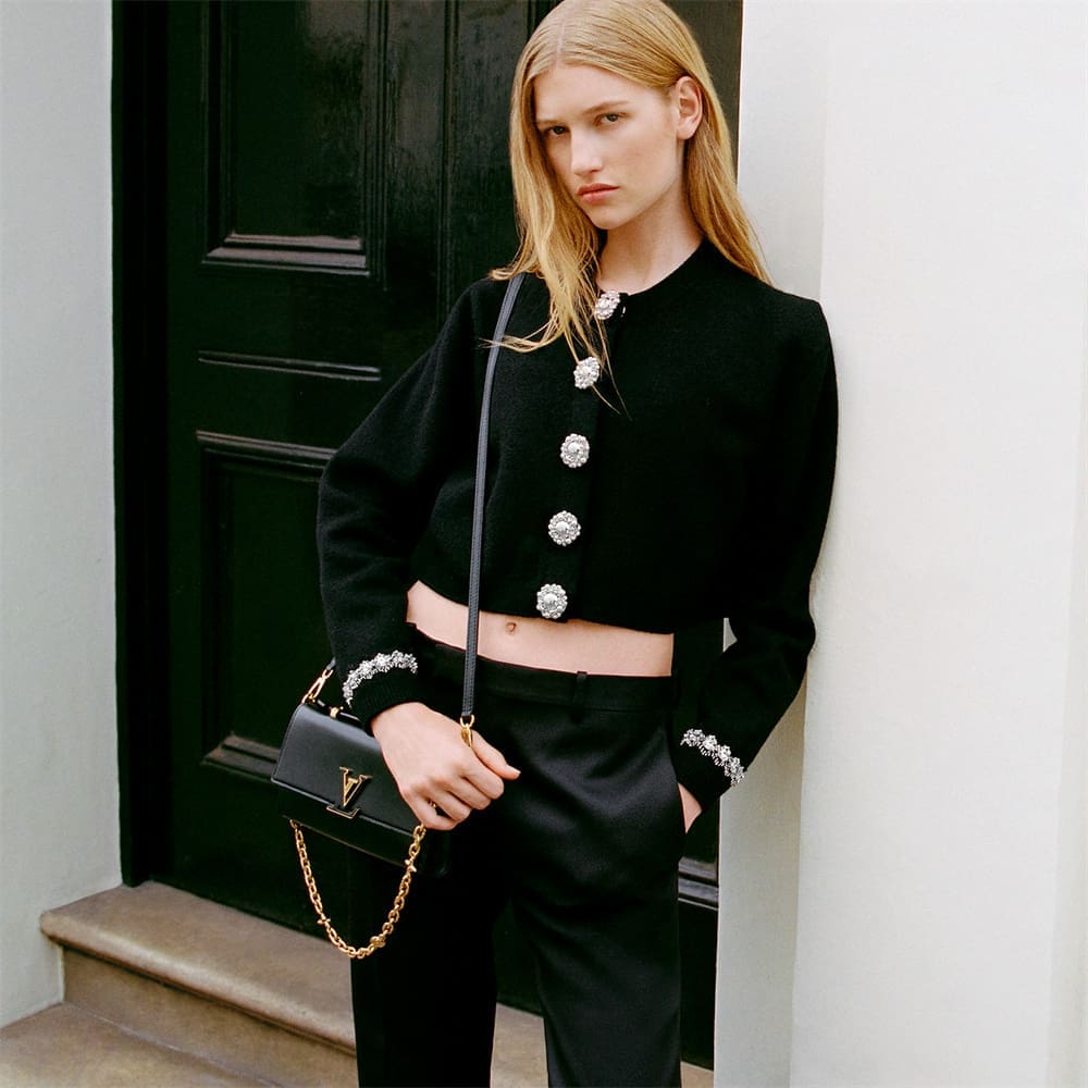 The iconic Capucines collection introduces this new Wallet On Chain, marrying the line’s exquisite craftsmanship with sophisticated allure. Crafted from smooth leather, it features a removable gold-toned chain as well as a removable leather strap and the House’s signature LV initials. The organized interior reveals a Monogram Flower magnetic closure, plus a flat pocket with three card slots. Carry it by hand, on the shoulder or wear it cross-body.