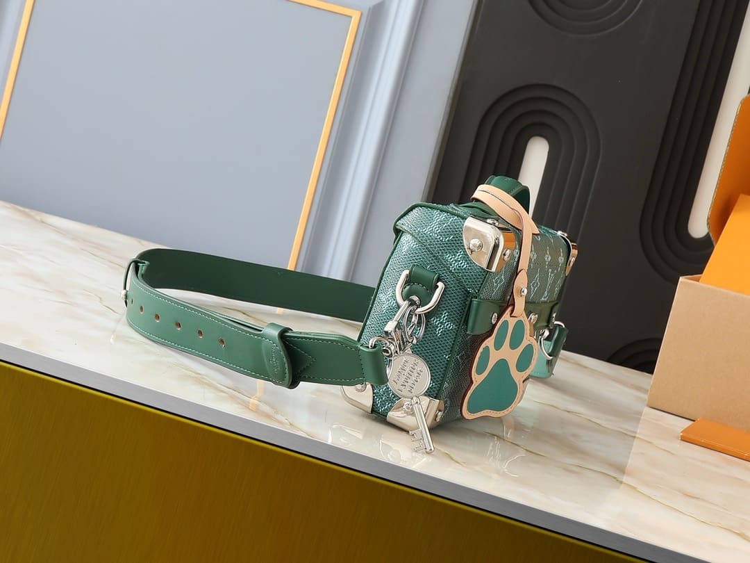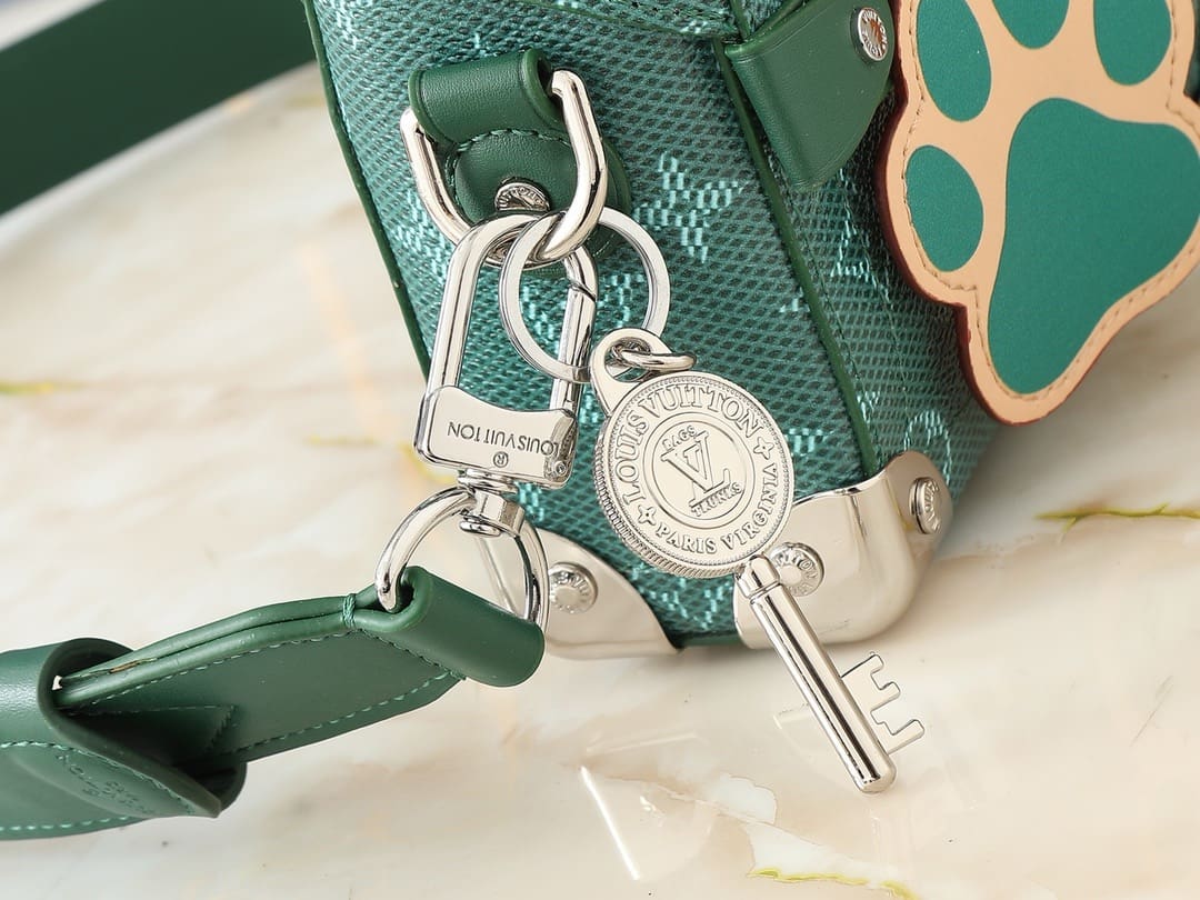The Soul Trunk is a compact cross-body bag made from bright Monogram Heritage canvas, with silver-toned corners and lock. The result of Pharrell Williams’ mixing of House codes, the bag features the “Marque L.Vuitton Déposée” signature, usually seen on Damier canvas. A removable charm in the shape of a dog’s paw with LV Initials signs this bag.