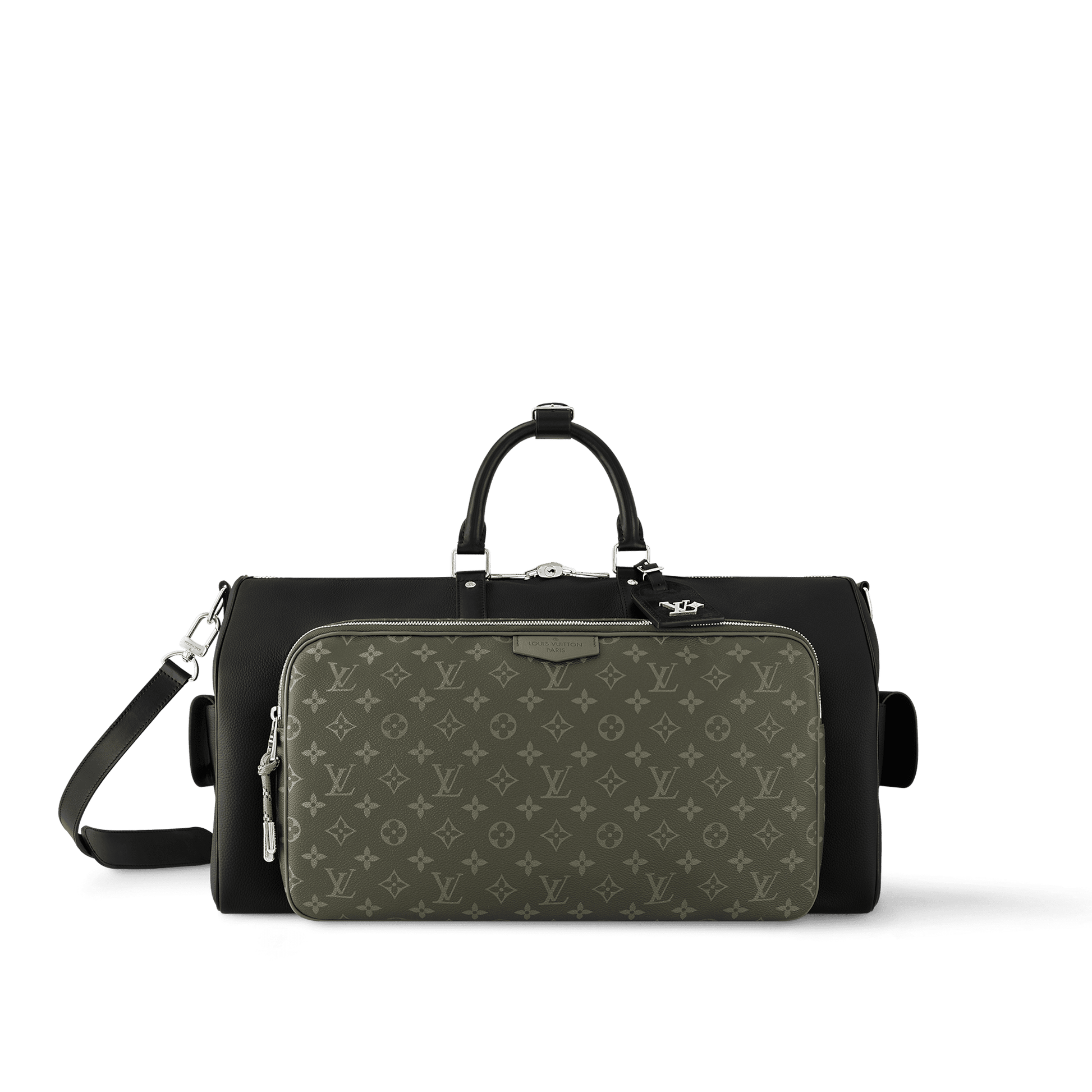 Part of the LV Park collection, the iconic silhouette of the Keepall Bandoulière 50 is reimagined with outside pockets that bring versatility. Made from Monogram coated canvas, the zipped side pocket perfectly complements the grained black leather of the bag, creating a patchwork feel. It features a removable LV Lovers name tag in suede.