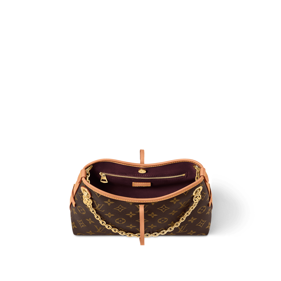 The CarryAll BB bag is made of Monogram canvas and features a striking chain with Monogram flowers, making it a trendy choice for both day and night occasions. The leather nameplate complements the lace-up closure, and the zippered interior pocket allows for easy access to credit cards.