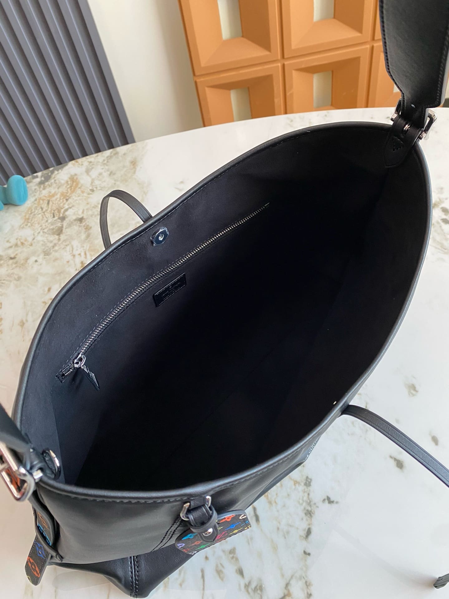The elegant CarryAll Vibe handbag is crafted from supple lambskin in a practical body-friendly shape with tone-on-tone cowhide trimmings and a roomy interior big enough to fit daily essentials, including a large smartphone. As part of the celebratory re-edition of the Louis Vuitton x Murakami collection, a multicolored Monogram motif adds a joyful pop of color to the removable strap and emblematic name tag. Complete with a removable inside pouch.