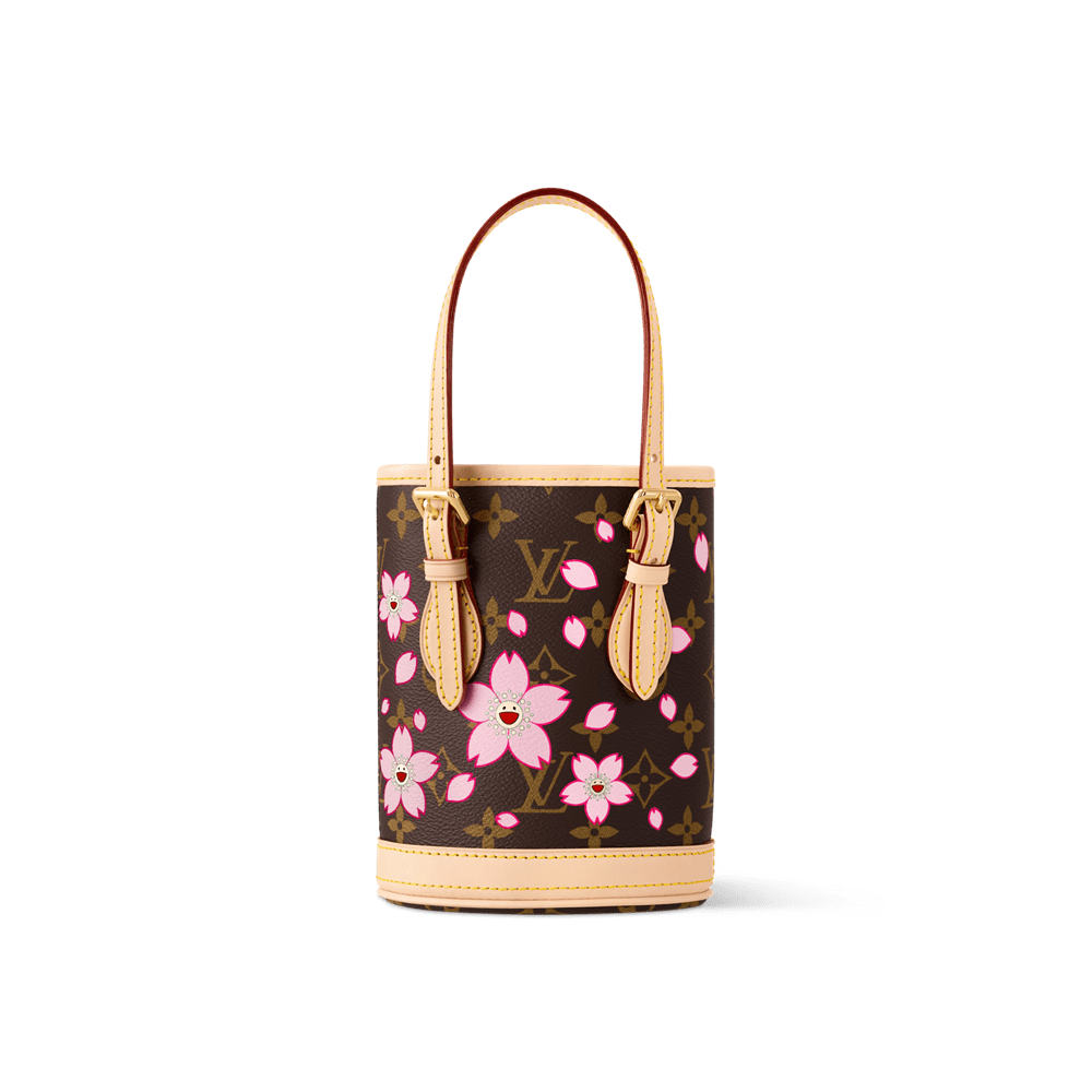 Presented in playful proportions, the bijou Nano Bucket projects timeless House codes in Monogram coated canvas accented with natural cowhide-leather trims and chic golden hardware. It is vibrantly uplifted with Japanese artist Takashi Murakami’s exuberant Cherry Blossom motifs, symbolizing renewal. A removable strap offers versatile carry options, while a coordinating removable leather key holder adds a practical detail.