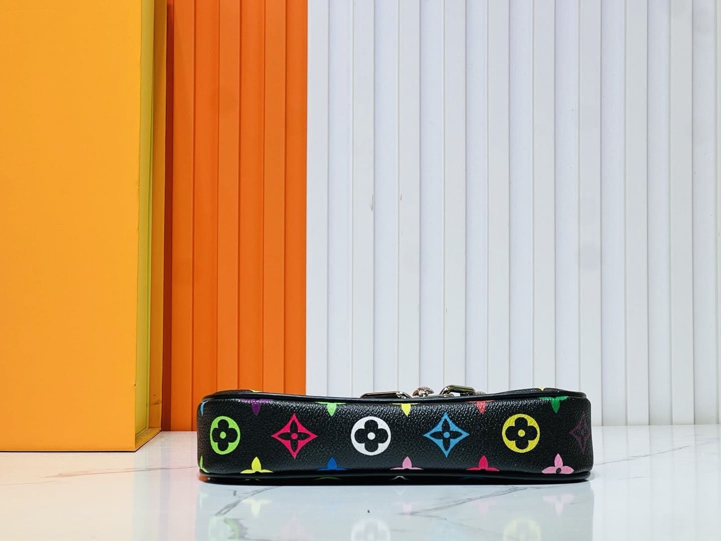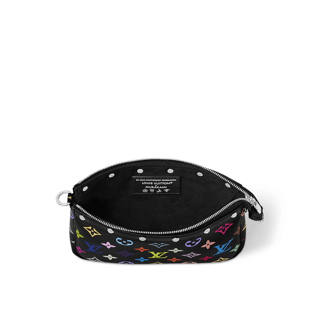 This playful edition of the classic Pochette Accessoires is joyfully reimagined with a multicolored Monogram motif as part of the cross-category Louis Vuitton x Murakami collection. Crafted from coated canvas in a petite pouch shape, a natural cowhide-leather trim adds an emblematic House touch, while golden hardware introduces a chic polished accent. Complete with a removable strap and chain for versatile styling options.