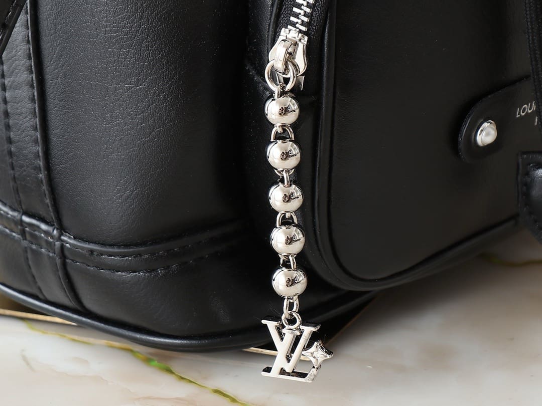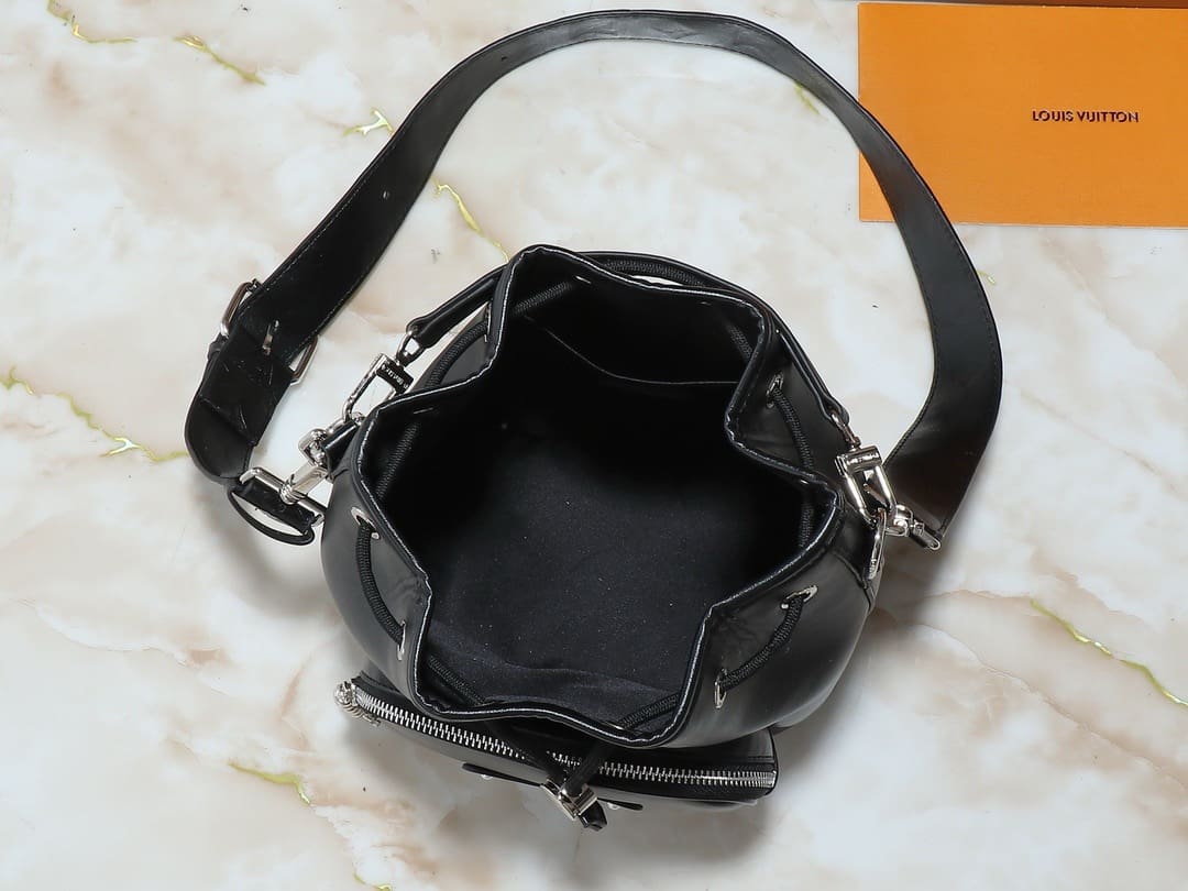 The Noé Cargo is a small bucket-style bag made from glossy black calfskin, with the technical brilliance of nylon, and lined in black textile. The silver-toned hardware, including the LV Initials connected to a ball chain, are the only elements to break the monochromatic aspect of the bag. The Noé features a roomy front pocket.