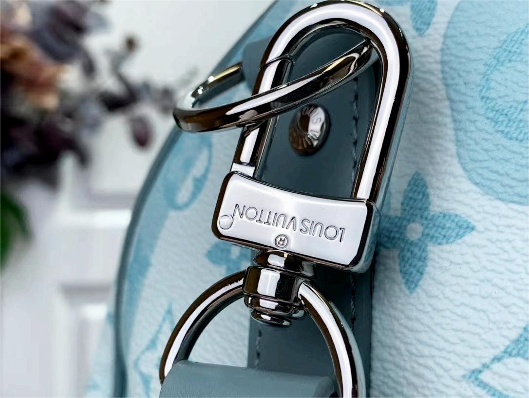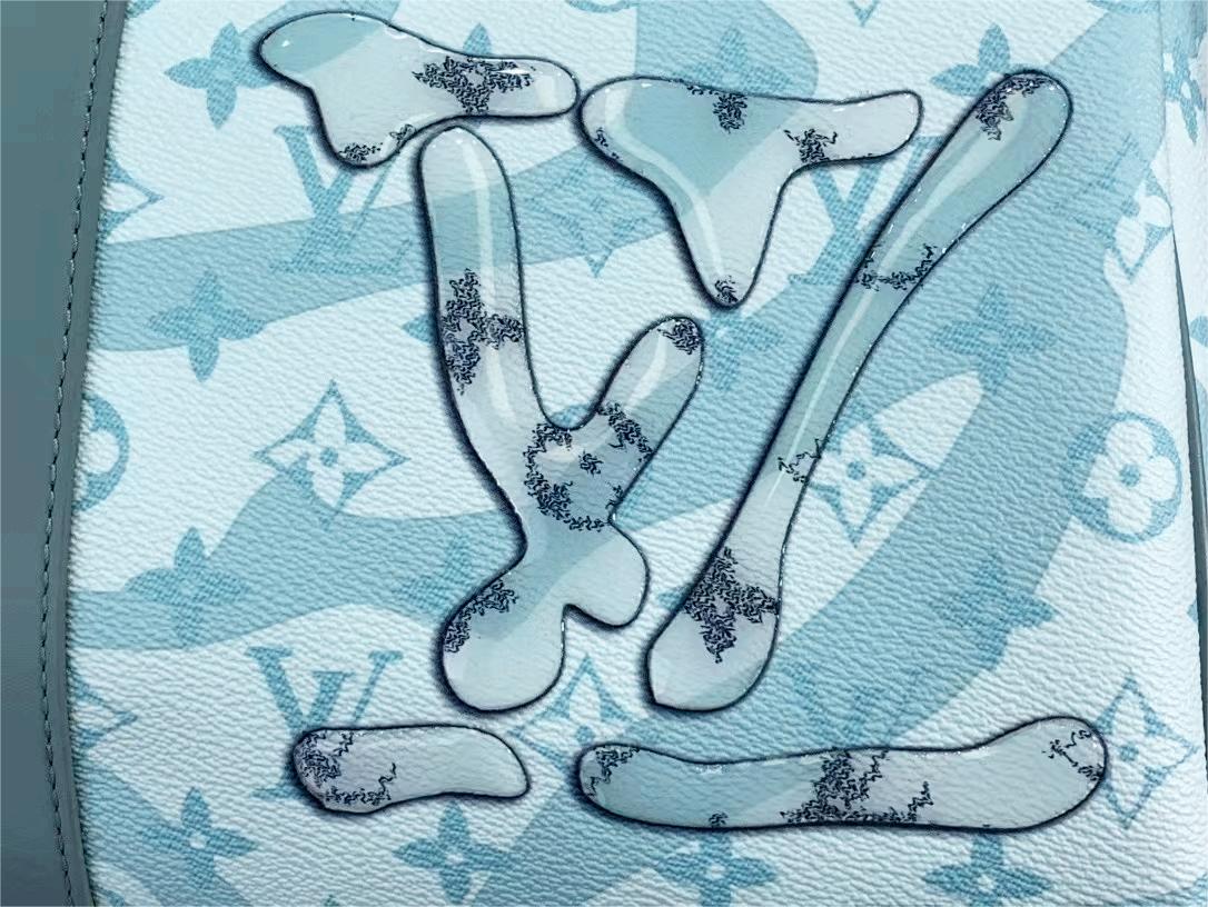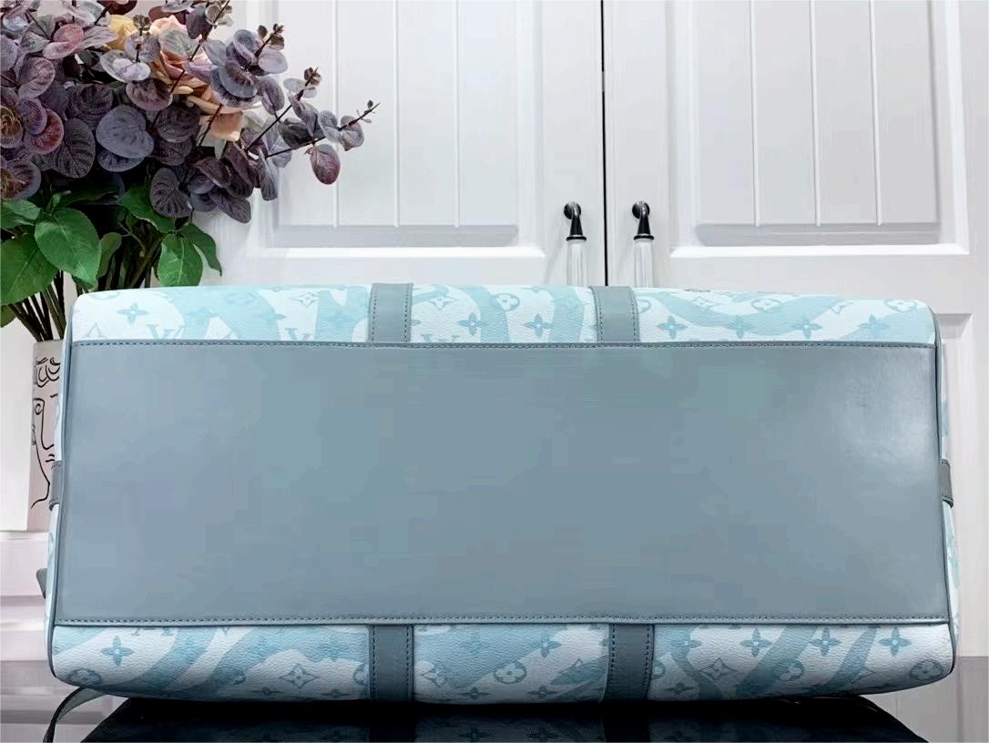 The Keepall Bandoulière 50 bag is made from Monogram Aquagarden canvas, with an aquatic version of Monogram pattern overlaid with surprisingly realistic water-drop renderings of the Monogram Flowers and LVs. The leather lateral bands, top handles, and name tag bring a structured feel to this classic travel bag.