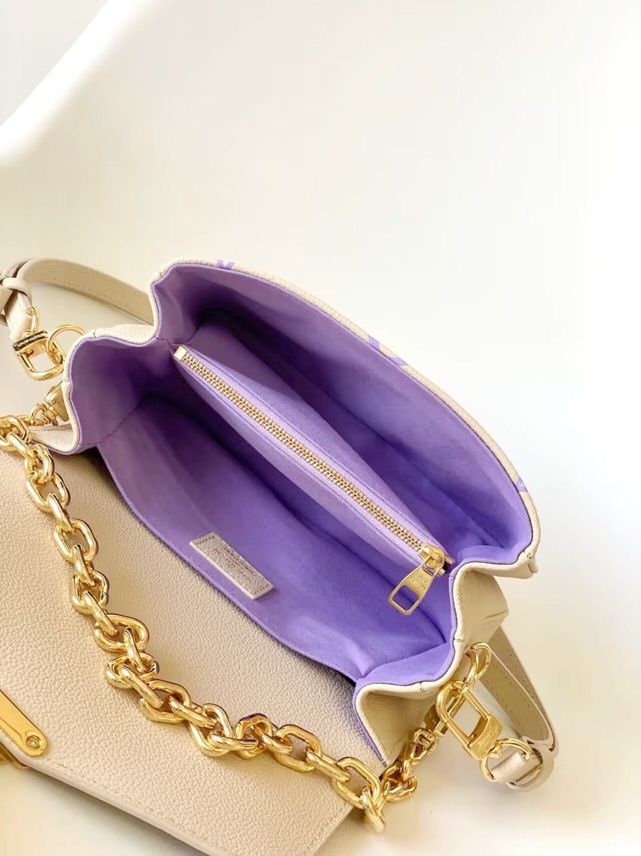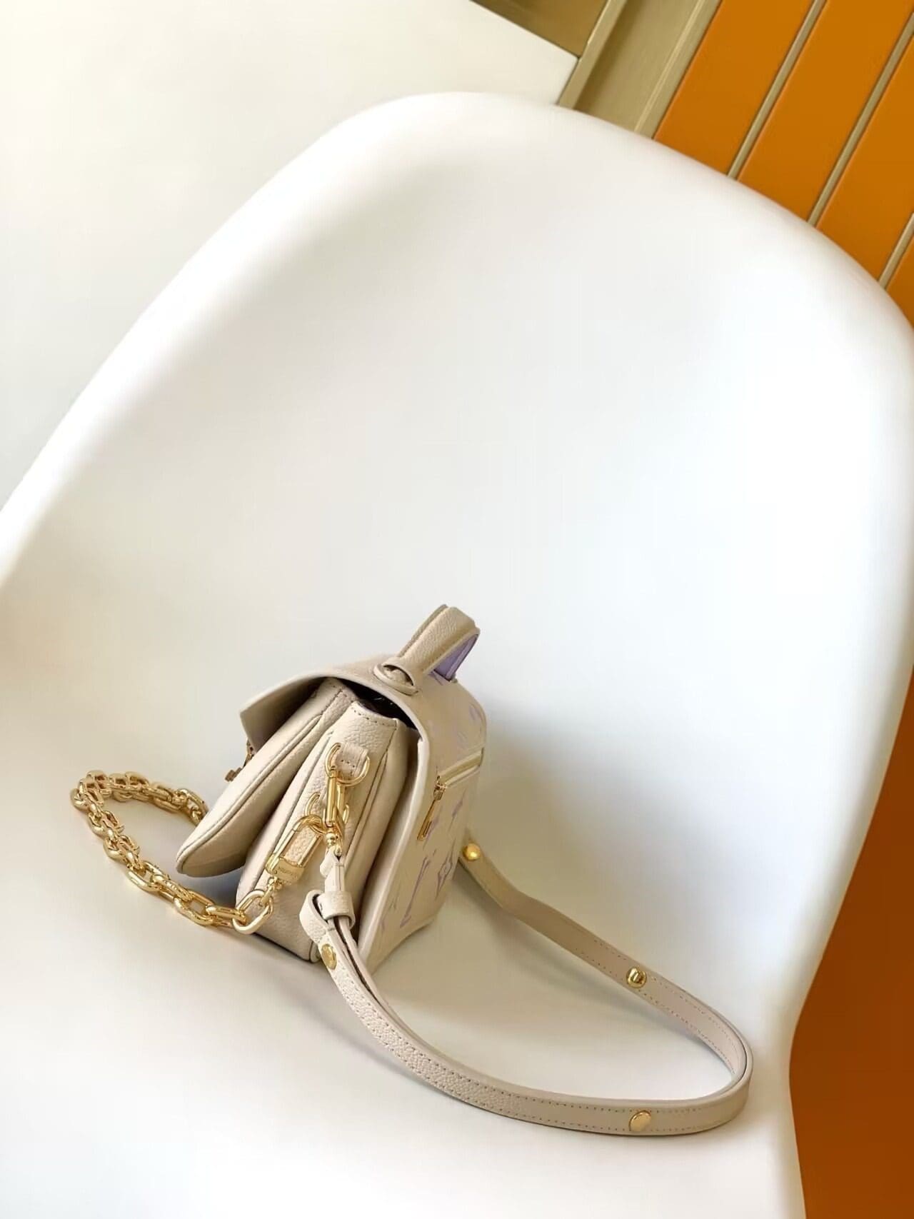 Part of the Milky Way capsule, the two-color Monogram Empreinte leather of this Pochette Métis East West handbag features a luminous off-white base with the Monogram motif embossed and then printed on the leather in a muted pastel tone. The Pochette Métis has a leather handle, a removable chain, and a detachable strap for carry options.