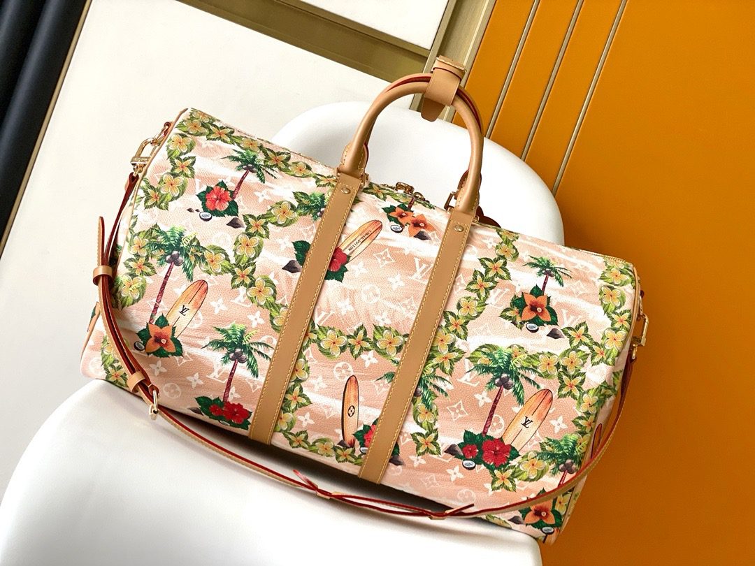 The classic Keepall Bandoulière 50 travel bag is eye-catching in Pharrell Williams’ Monogram Surfin’ coated canvas. The elaborate print juxtaposes vintage-style tropical motifs with classic House patterns like the Monogram Flowers. The Keepall is trimmed with natural cowhide-leather to give the bag a vintage feel.