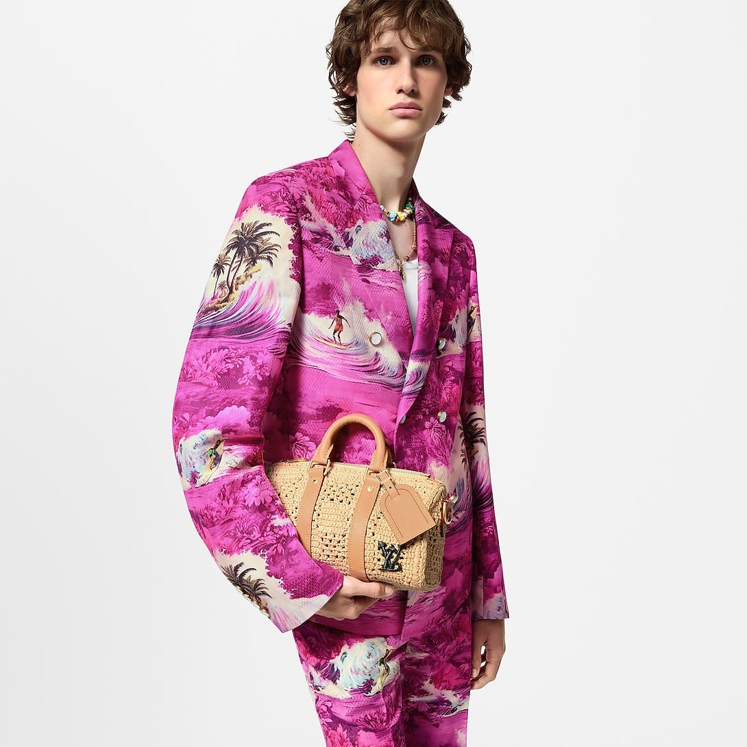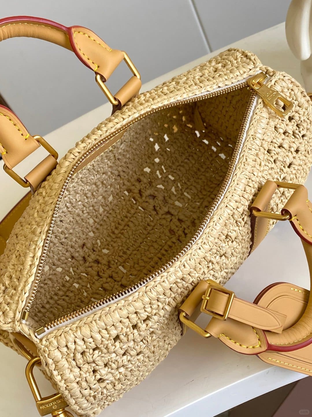Showcasing the House’s superior craftsmanship, this Keepall Bandoulière 25 is hand-made from natural palm fibers; the shell of the bag taking about 40 hours to create. The woven Damier pattern is paired with natural leather trim, evoking the House’s heritage design codes. It’s signed with hand-crafted black-raffia LV Initials.
