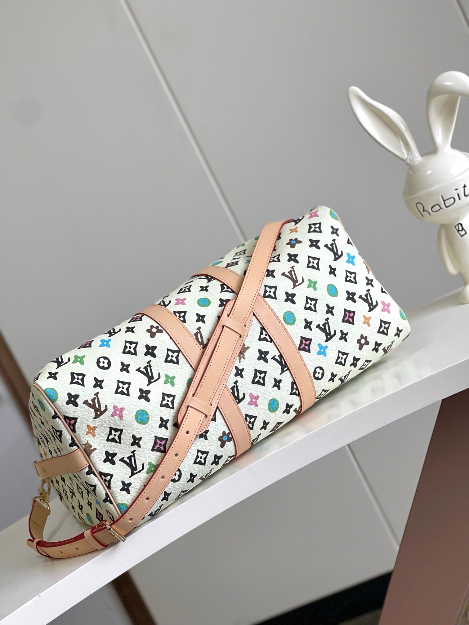 The practical Keepall Bandoulière 45 travel bag looks fresh in Monogram Craggy canvas, Tyler, colorful new reinterpretation of the classic Monogram. It’s signed with the removable wavy name tag. Two rolled-lather top handles and a detachable and adjustable shoulder strap give carry options.