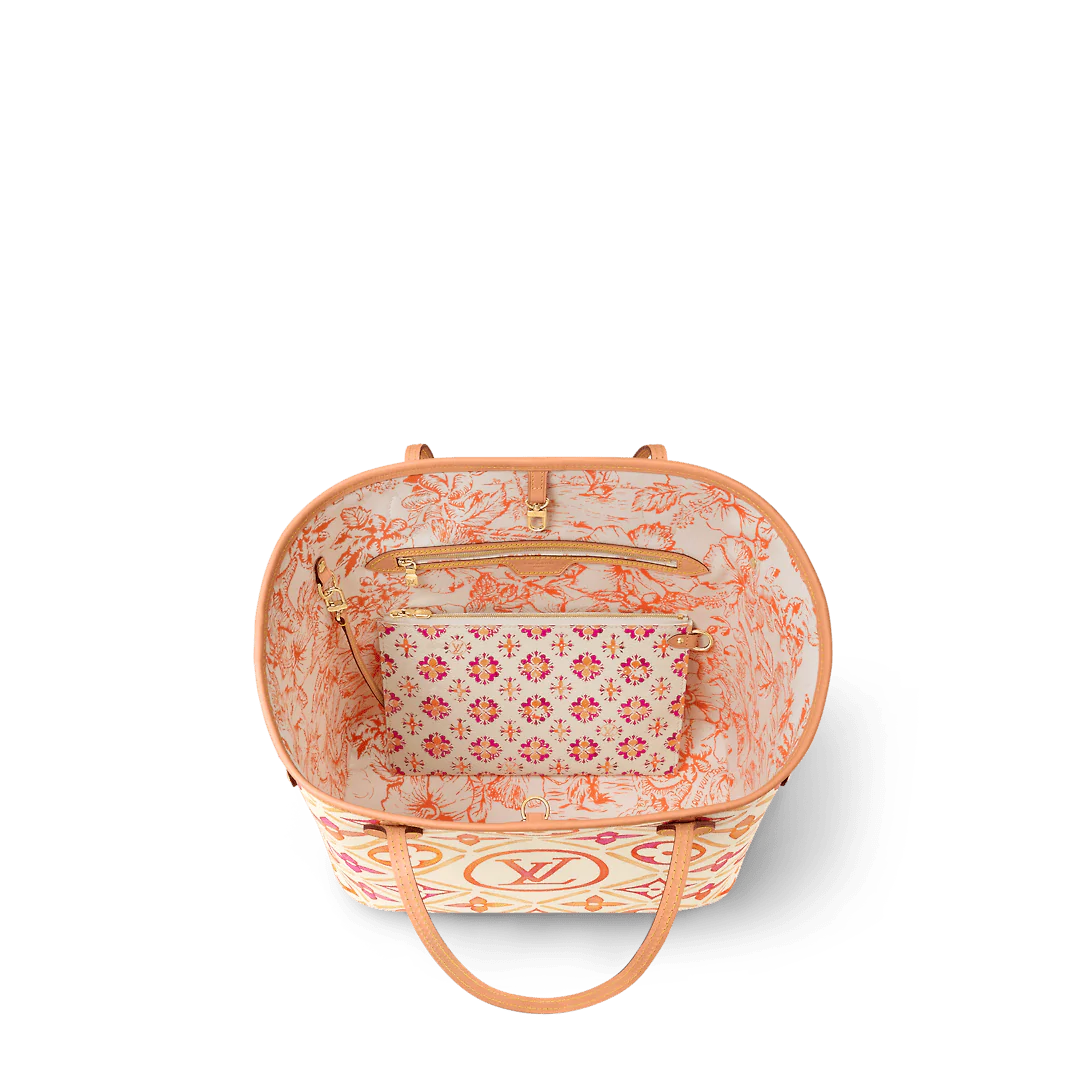 The Neverfull MM tote is made from Monogram Tiles canvas with leather trim along the top of the bag and on the handles. The Monogram pattern has a watercolor aspect and features the LV Circle in the center. It comes with a zipped pouch, with a complementary print, that can be removed and used separately.