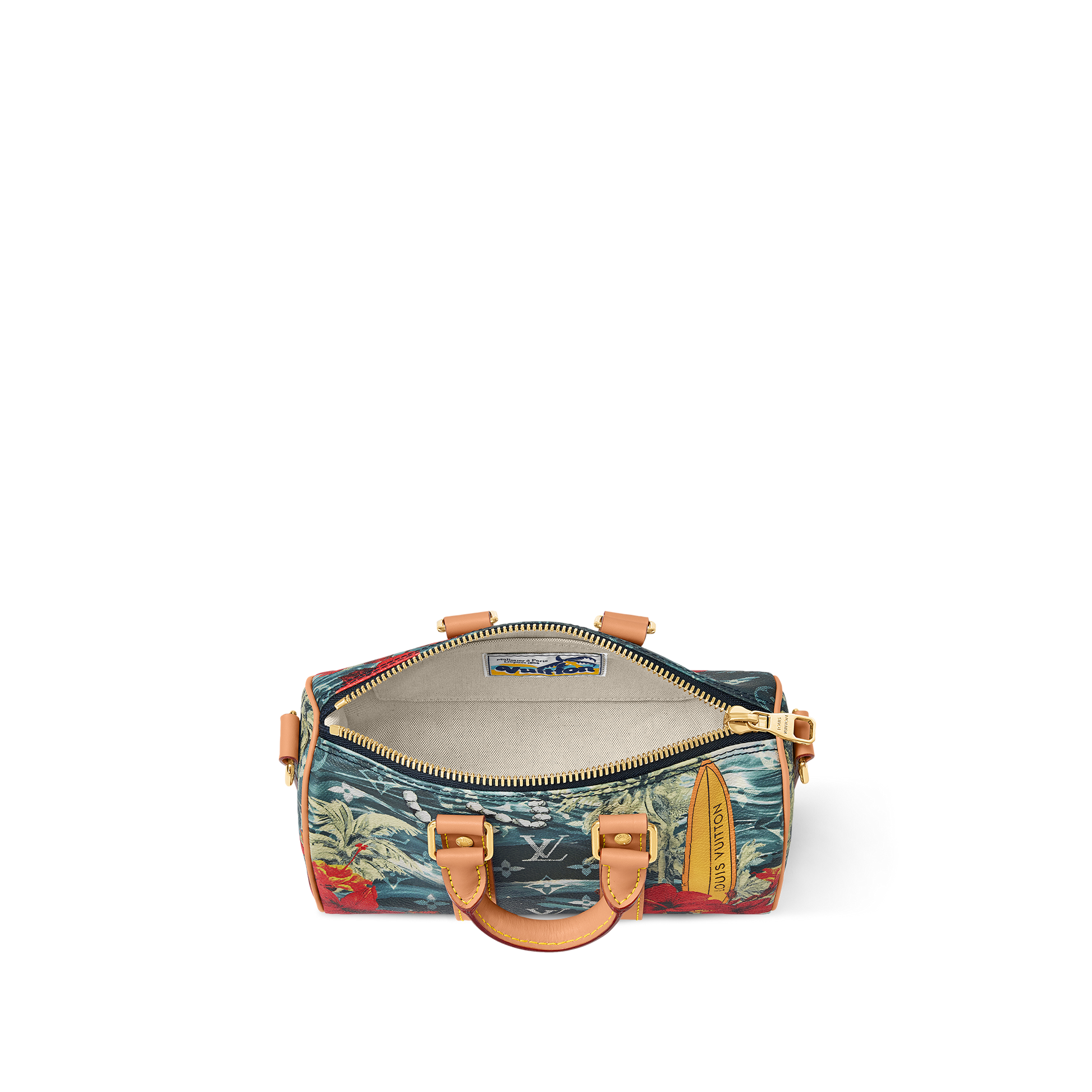 The Keepall Bandoulière 25 is a smaller version of Louis Vuitton’s famous Keepall travel bag. It’s made from Pharrell Williams’ Monogram Surfin’ canvas, with its intricate print combining different summery motifs. The bag’s design and tropical print give this city bag a vintage feel. A detachable strap and two rolled-leather top handles enable carry options.