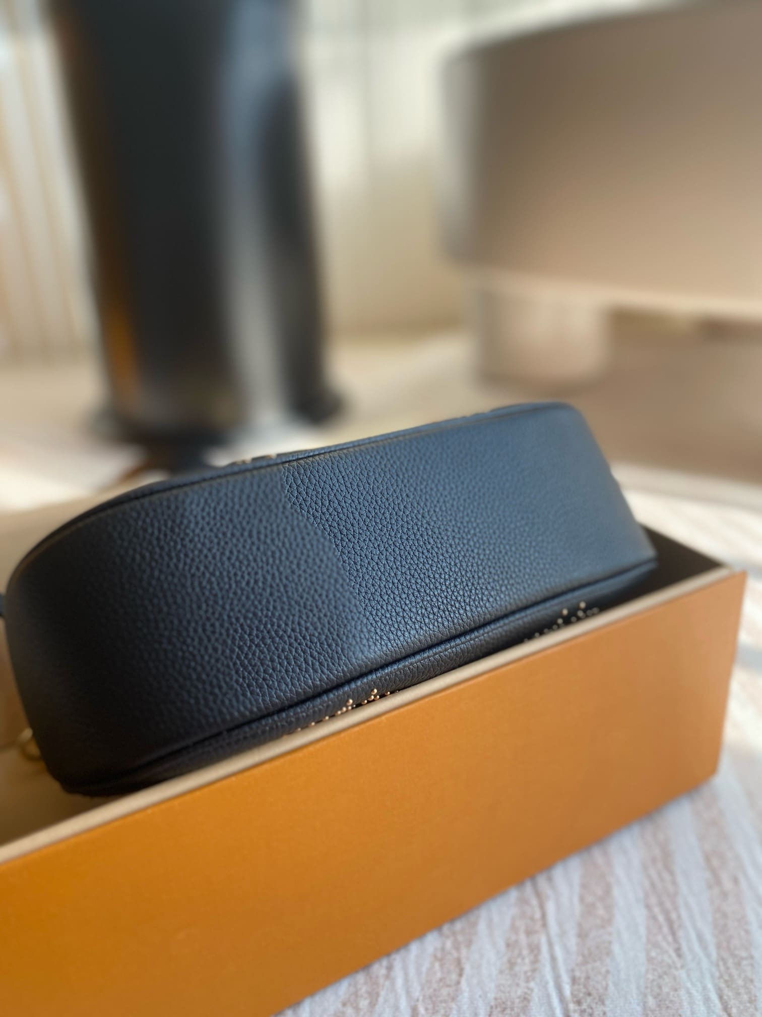 This rock-chic version of the Bagatelle handbag is made from Monogram Empreinte leather, with gold-color studs forming the iconic Monogram pattern. The meticulous process of applying the studs is a testament to the House’s craftsmanship. Each stud is coated with 0.25 microns of gold. There’s a removable handle and a detachable and adjustable strap.