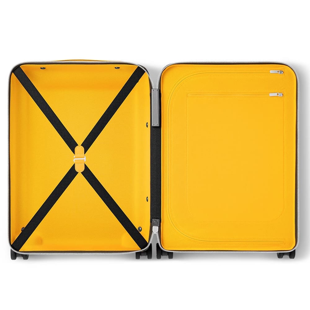 This Horizon 55 rolling hardcase is made from Monogram Macassar canvas with leather trim in a lively color. The textile lining is in the same color as the exterior trim. This cabin-sized bag is remarkedly roomy thanks to its innovative design: the cane is positioned on the exterior to maximize internal space.