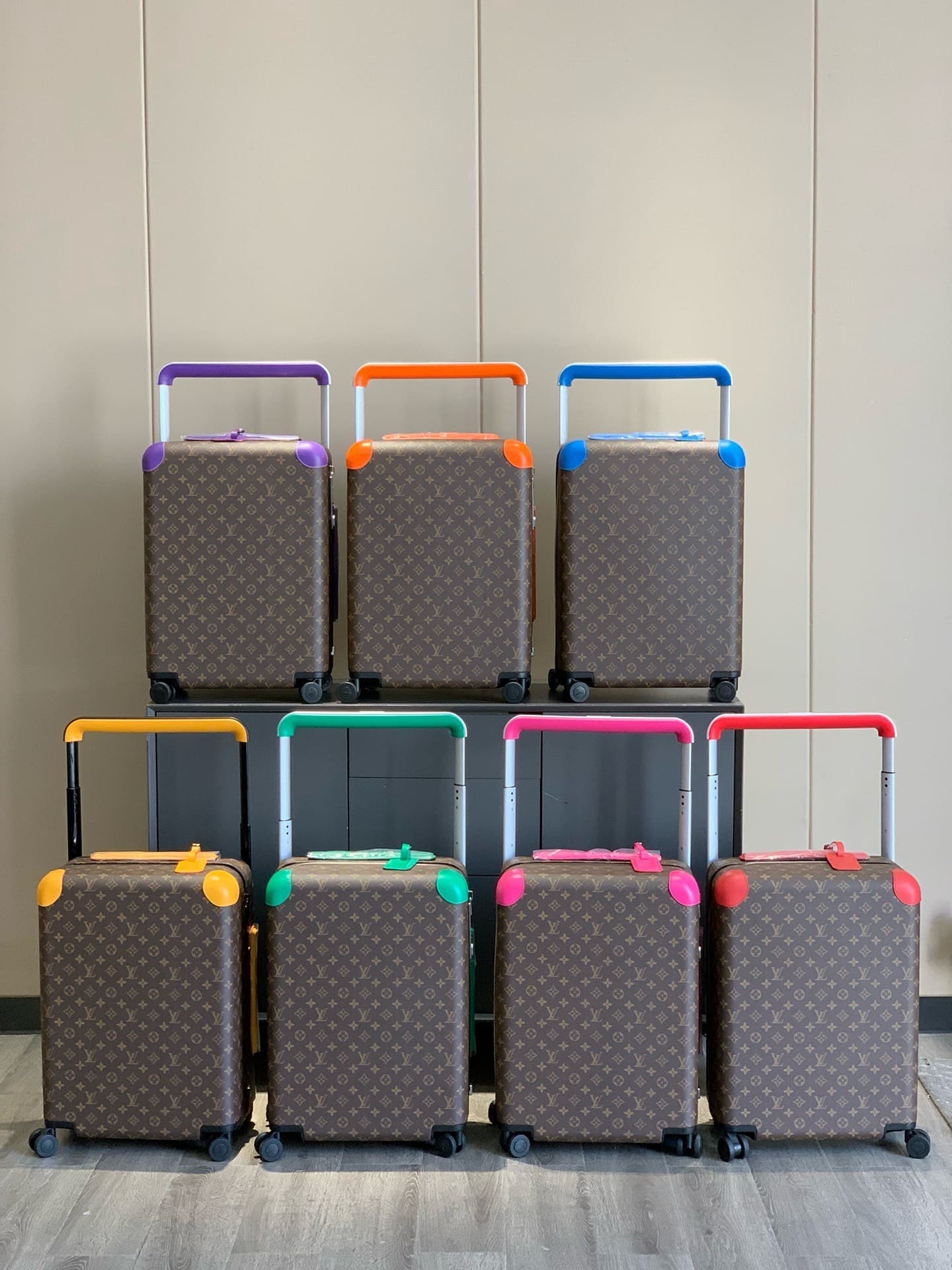 The perfect combination of tradition and modernity, the Horizon 55 rolling suitcase is made from iconic Monogram Macassar canvas with bright-colored leather trim, including on the reinforced corners and top handle. The bag’s unexpectedly spacious interior is lined in matching-colored textile. This case can be used as carry-on baggage.