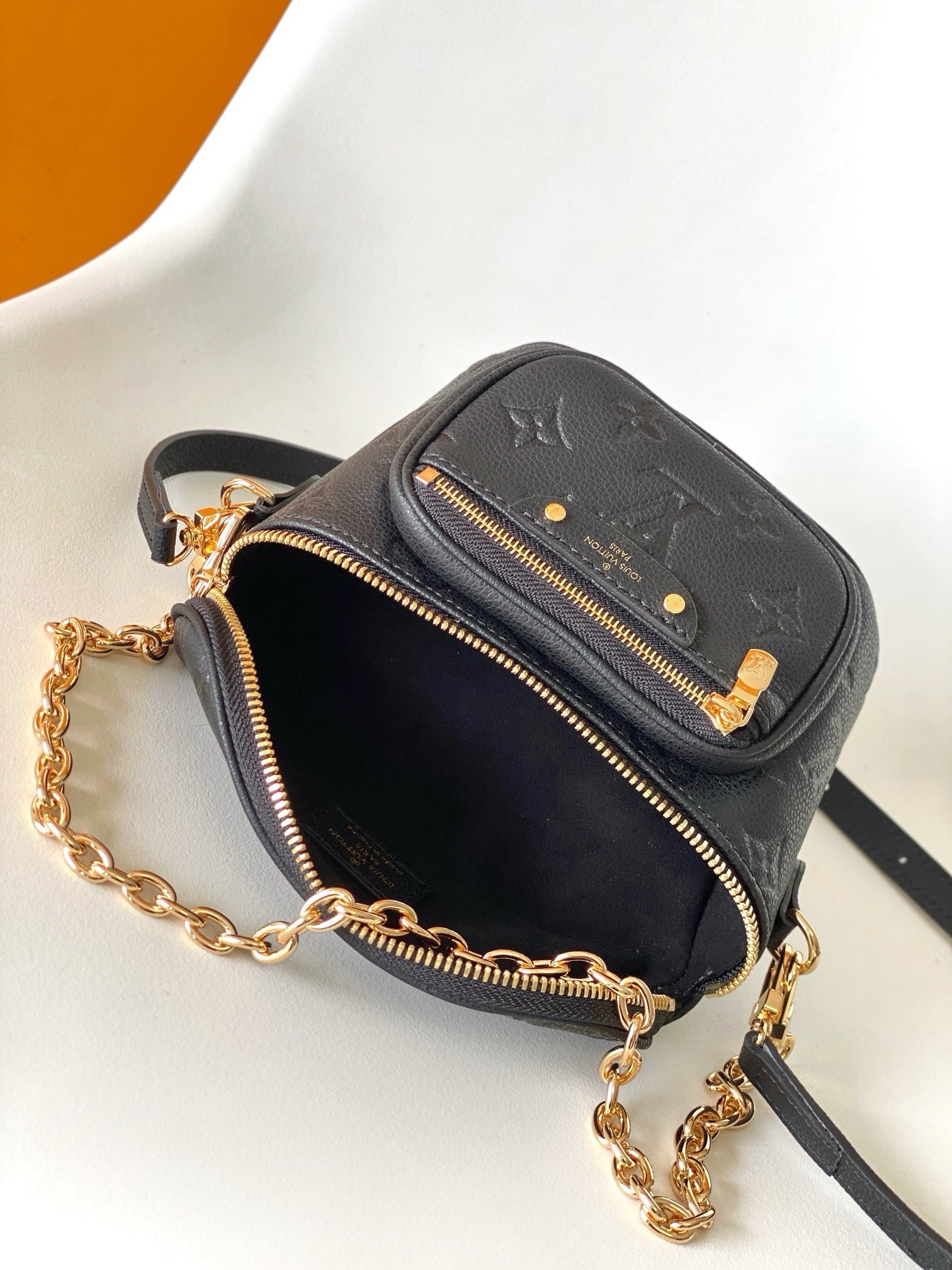The Mini Bumbag is reinterpreted in supple, grained Monogram Empreinte leather, which is embossed with the Monogram pattern. This on-trend piece features a removable, adjustable strap and a removable, gold-tone chain for different looks and carry options. It has a zipped main compartment and a zipped front pocket with an embossed leather tag.
