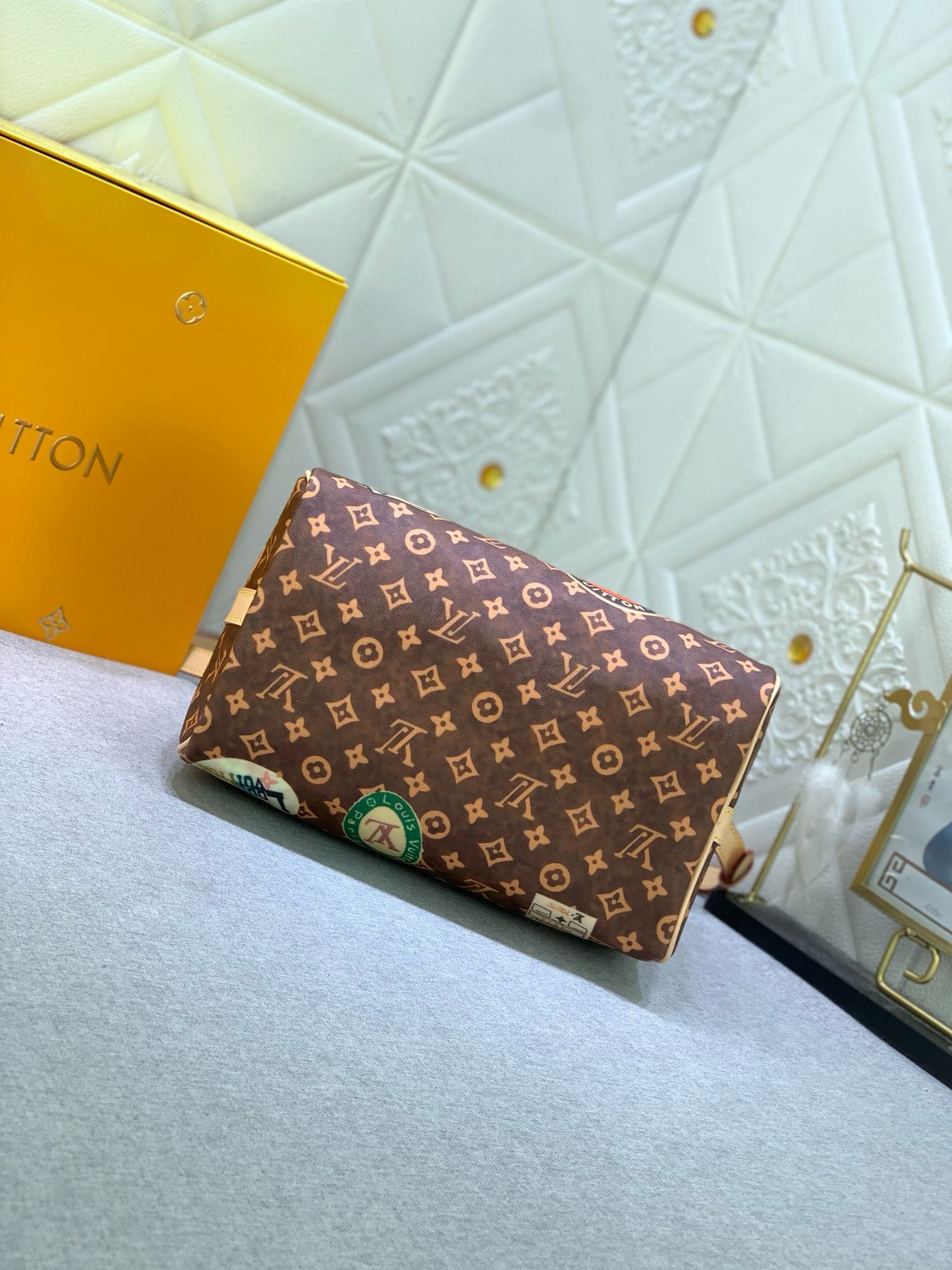 The Speedy Bandoulière 30 handbag comes in a version inpired by our archival Monogram canvas: a blend of cotton and linen with a sheer resin coating. Embellished with a patchwork of hotel labels in homage to Gaston-Louis Vuitton’s legendary collection, this timeless piece is trimmed with the Maison’s natural cowhide-leather, an elegant heritage touch.