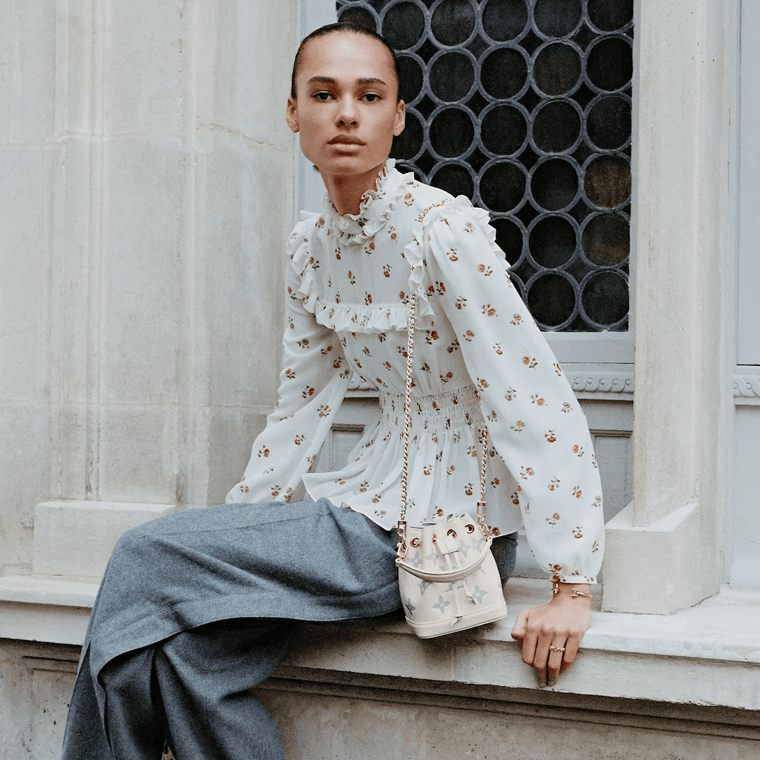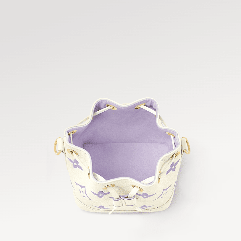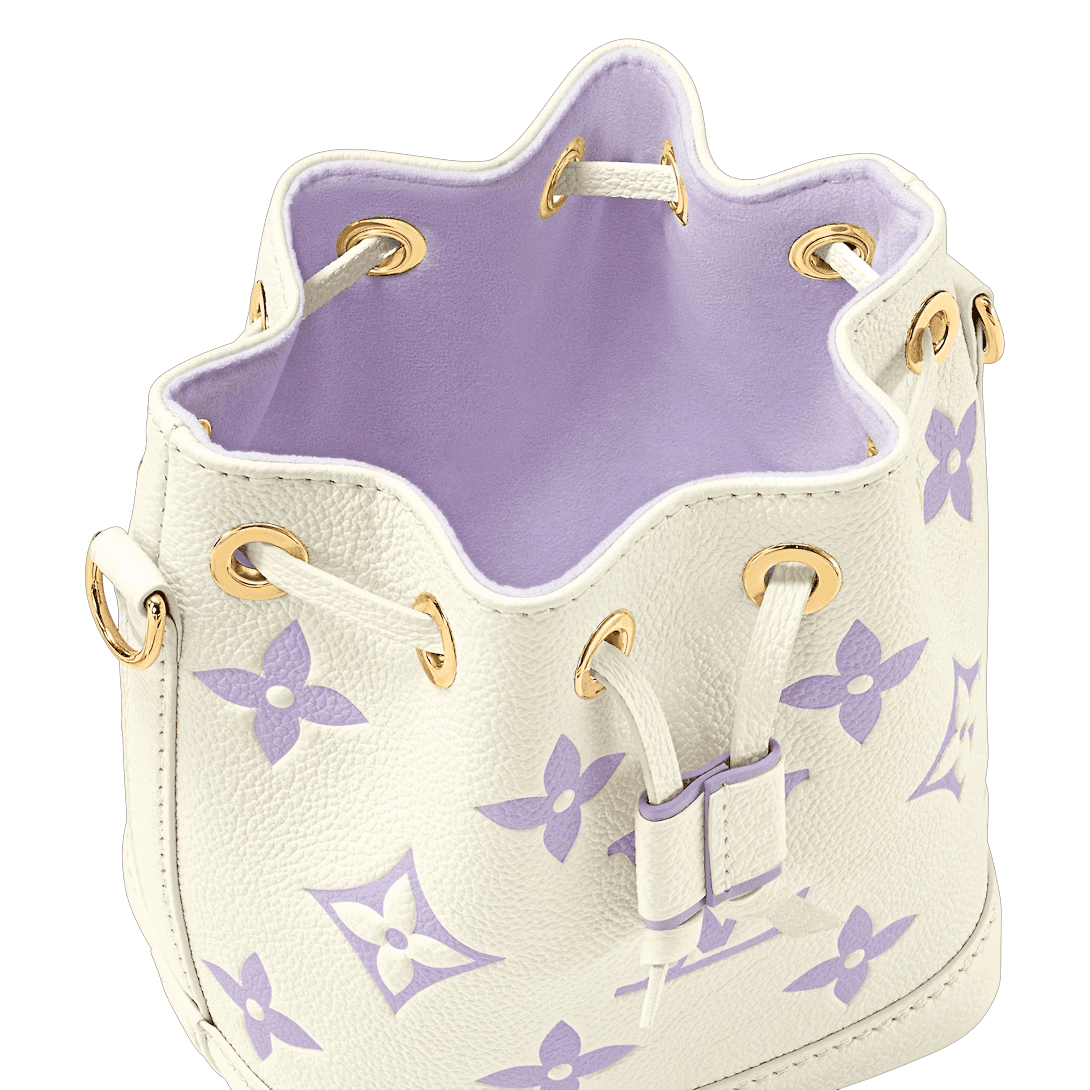 This seasonal edition of the Nano Noé bag comes in supple, embossed Monogram Empreinte leather in a delicate, bicolor palette. Notable for its drawstring closure, this miniature replica of the iconic Noé bag offers several carry options thanks to its removable handle and removable, gold-tone chain, which is interlaced with leather.