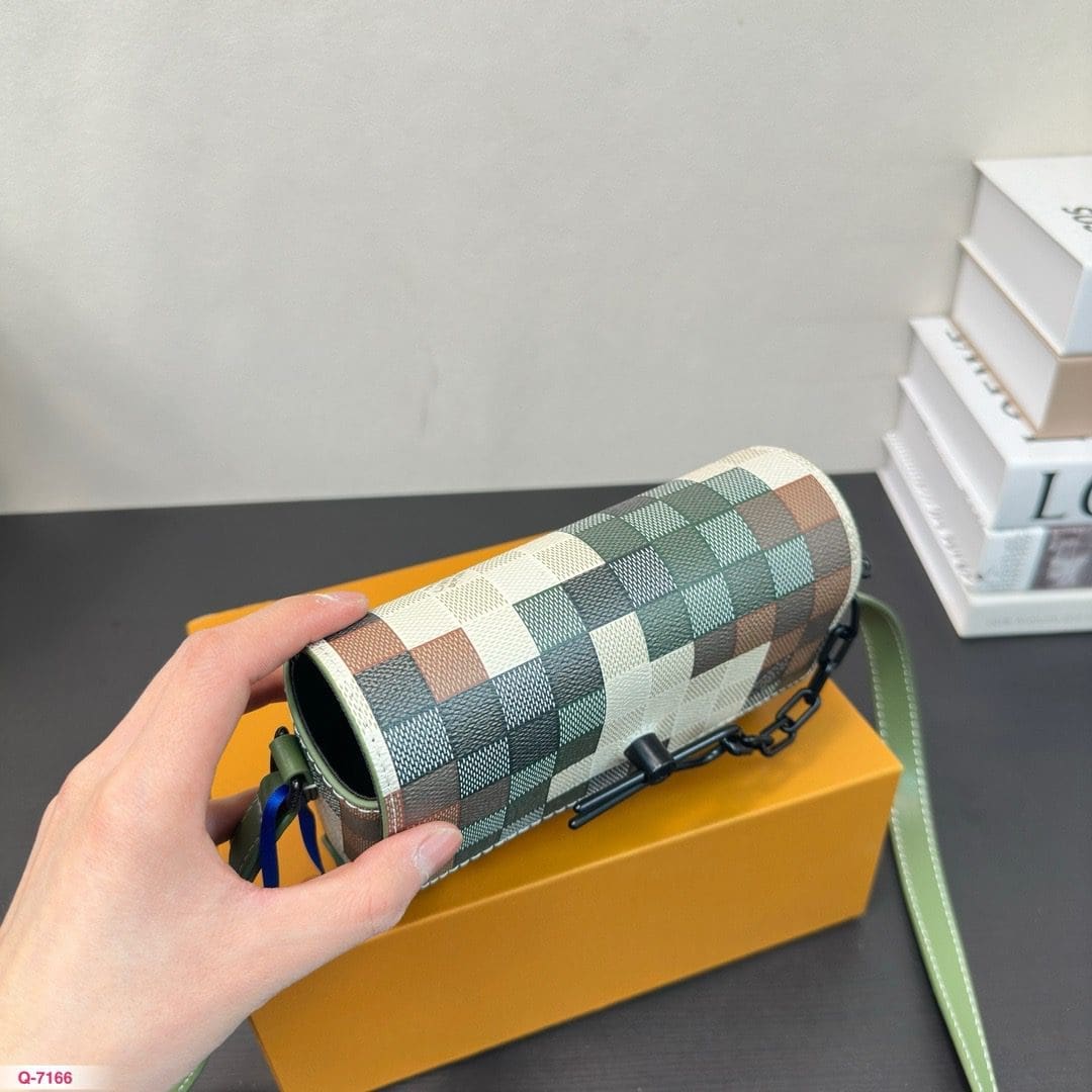Creative Director Pharrell Williams brings his new Damoflage coated canvas to the Steamer Wearable Wallet. The Damoflage motif is a brilliant mashup of Damier checkerboard with camouflage for a pattern that’s modern and historic at once. The black-color pin-and-chain, from the House’s original steamer trunks, completes the design.