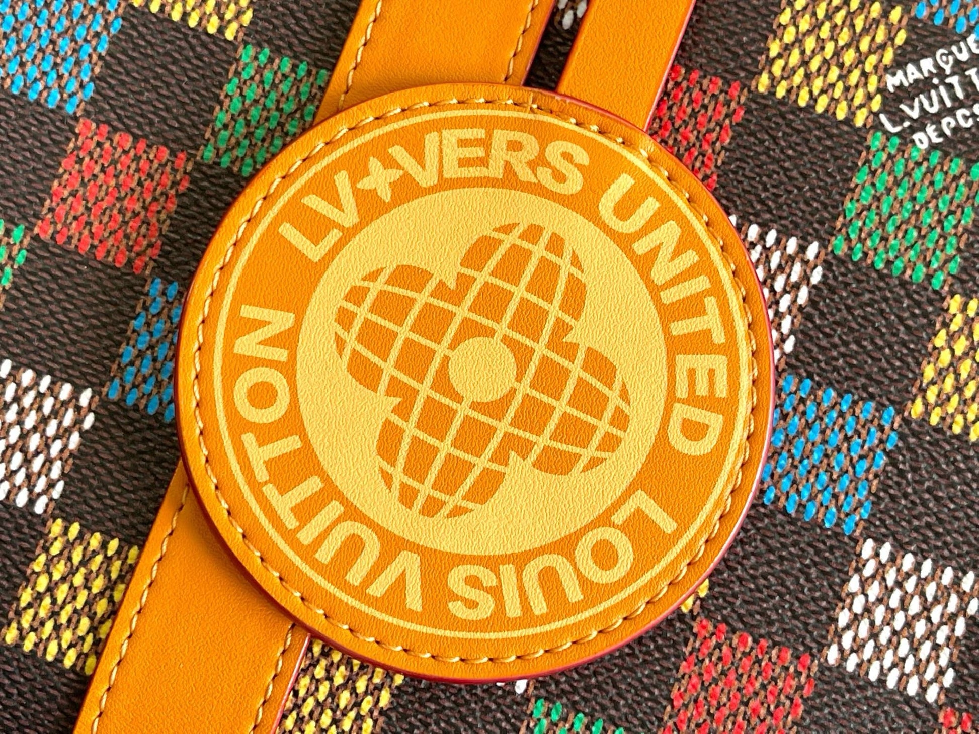 The Keepall Bandoulière 50 travel bag is fashioned from Damier Ebene canvas, on which a multicolor checkerboard pattern is printed. The pattern is punctuated with “Marque Louis Vuitton Déposéee” in some of the squares. The pearl zip-pull and removable leather tag, a cross between a globe and a Monogram Flower, complete Pharrell Williams’ design.